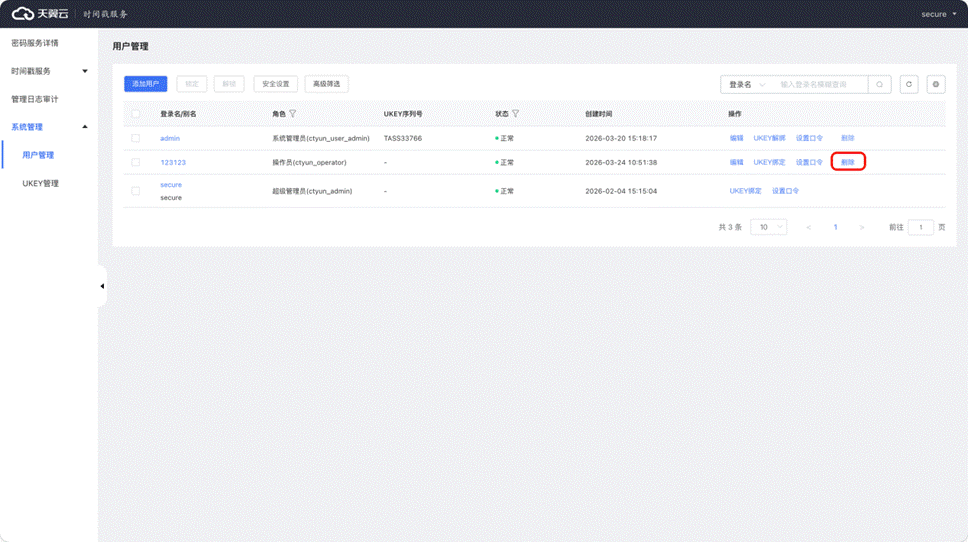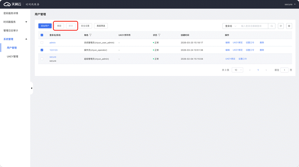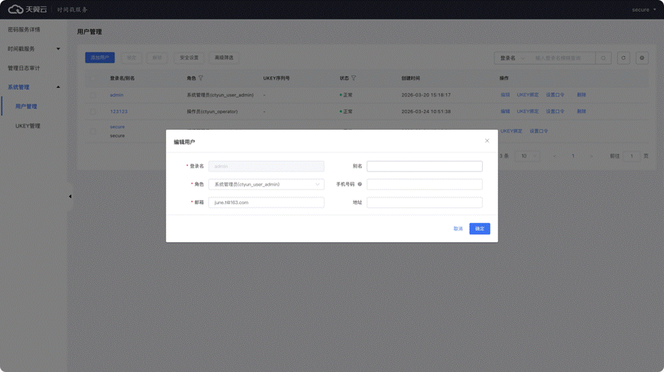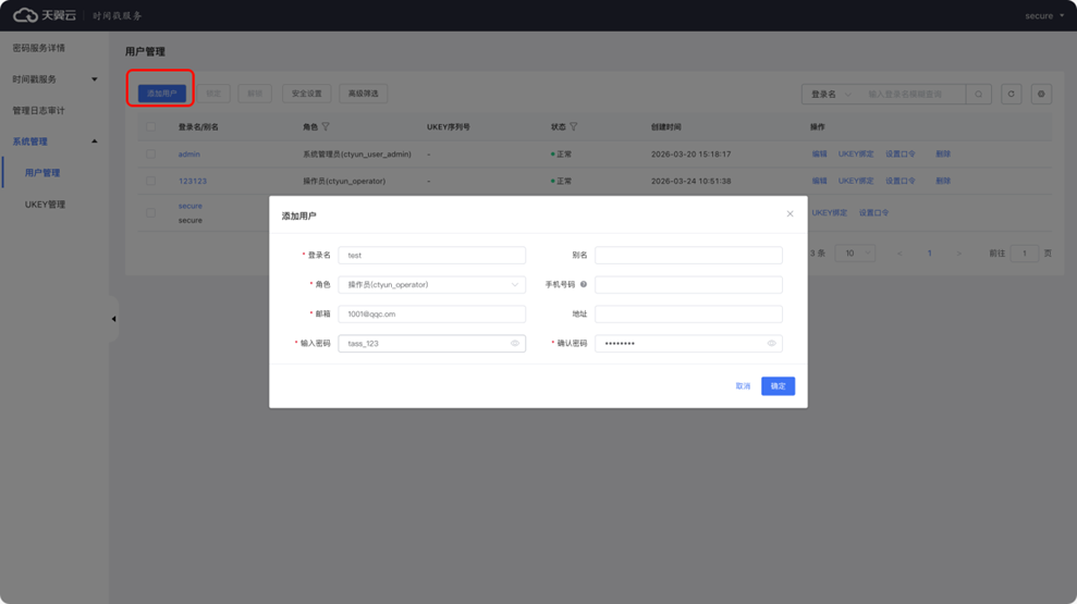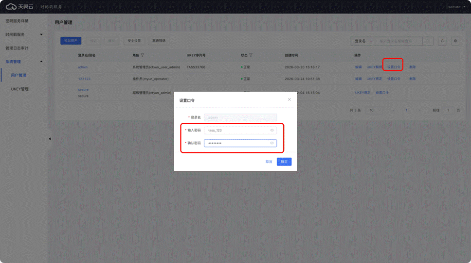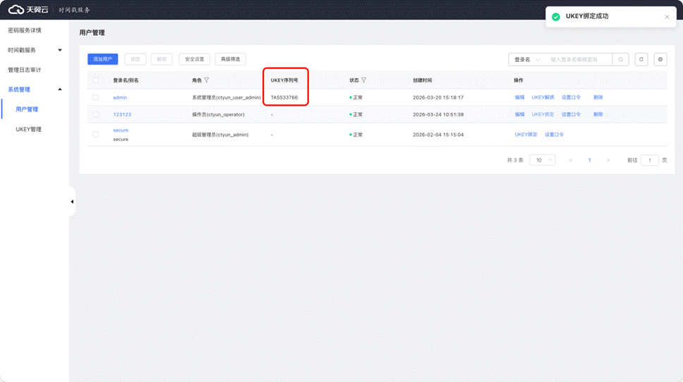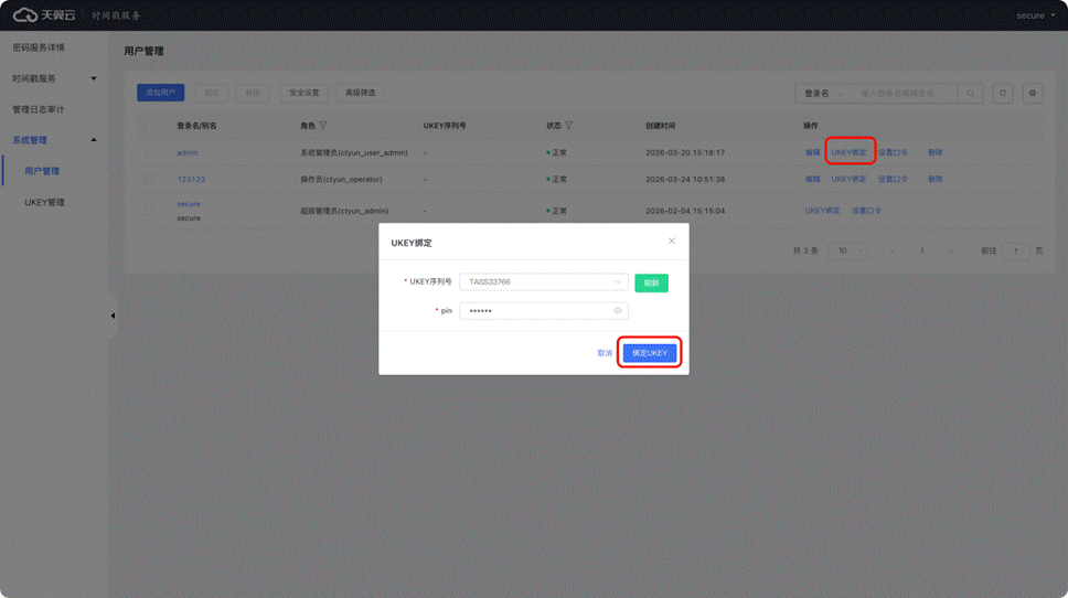 可以为某个用户进行ukey绑定操作(进行ukey绑定前需要下载对应版本的UKEY控件和插入对应的UKEY)绑定完成后对应的用户可以使用UKEY进行登录