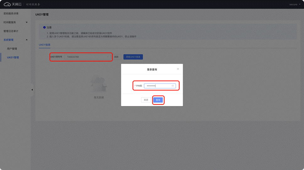 进入UKEY管理界面后,选择对应的UKEY并输入PIN码,点击查询即可获取到对应的UKEY信息(在进行UKEy信息查询前需要先安装对应版本的UKEY控件和插入对应版本的UKEY)