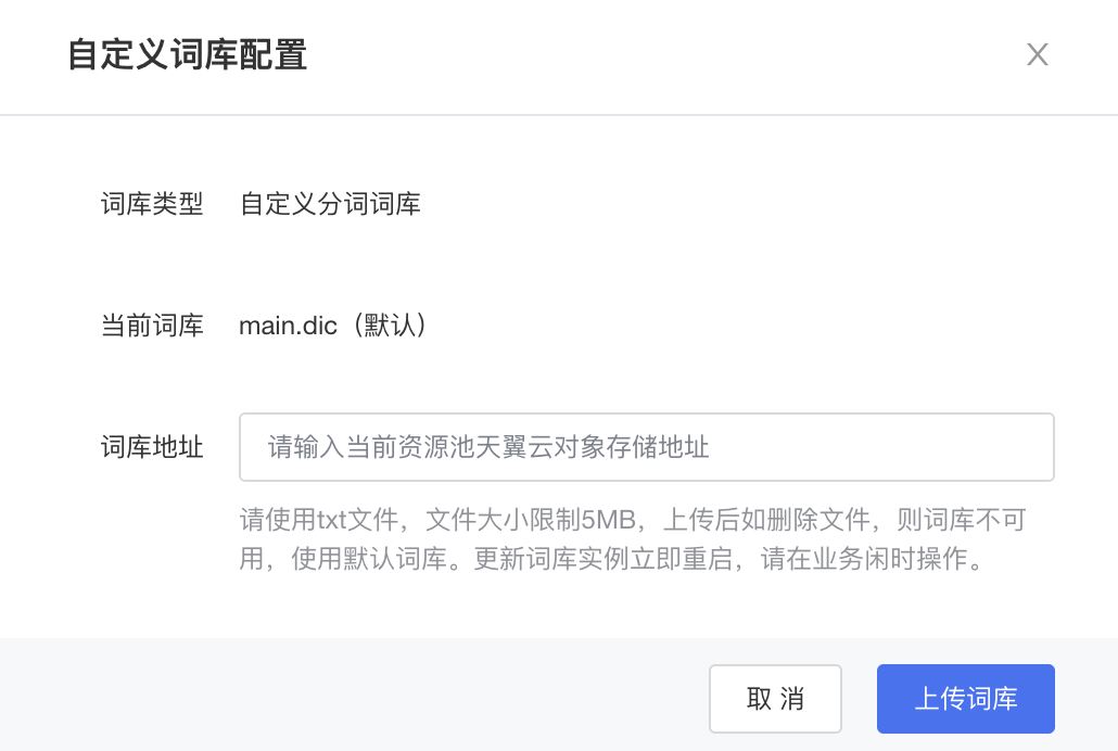 1. 词库上传成功后,实例会对对应的自定义词库进行配置,配置期间实例将会重启,请在业务闲时操作。