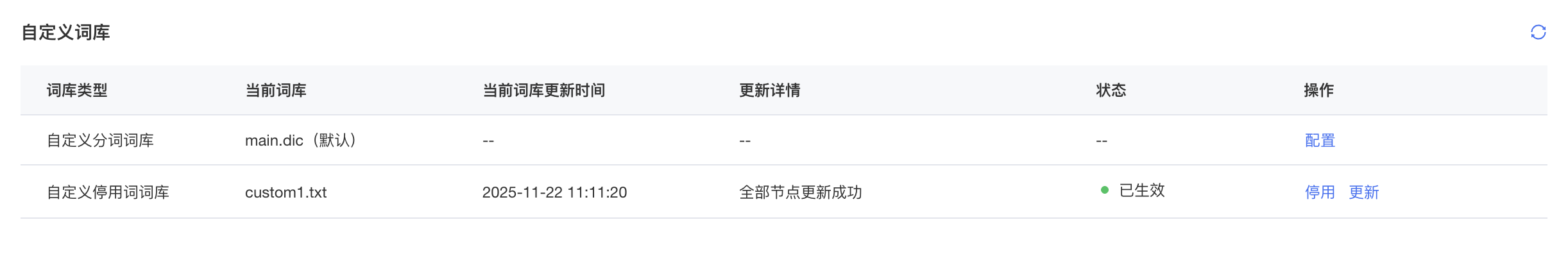 2. 更新词库成功后,新词库大约2分钟生效,如需要更新词库文件,请在对应行点击“更新”,词库为覆盖更新;如需停用指定词库,请在对应行点击“停用”,停用后对应词库使用默认词库。更新词库文件和停用词库都会带来实例重启,请在业务闲时操作。新词库添加后,仅支持对新创建的索引进行分词,存量索引不会基于该词库进行重新分词。如需重新分词,请对目标索引进行重建索引。