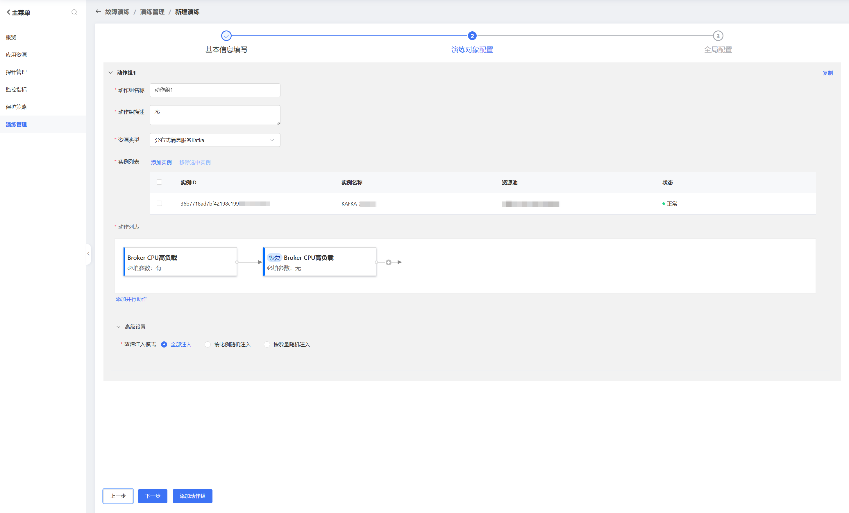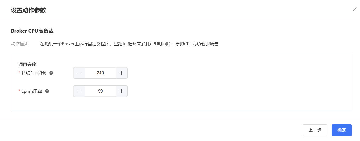 在动作列表栏目点击立即添加,选择演练动作Broker节点CPU高负载,点击下一步进行动作参数设定,点击确定完成动作添加。