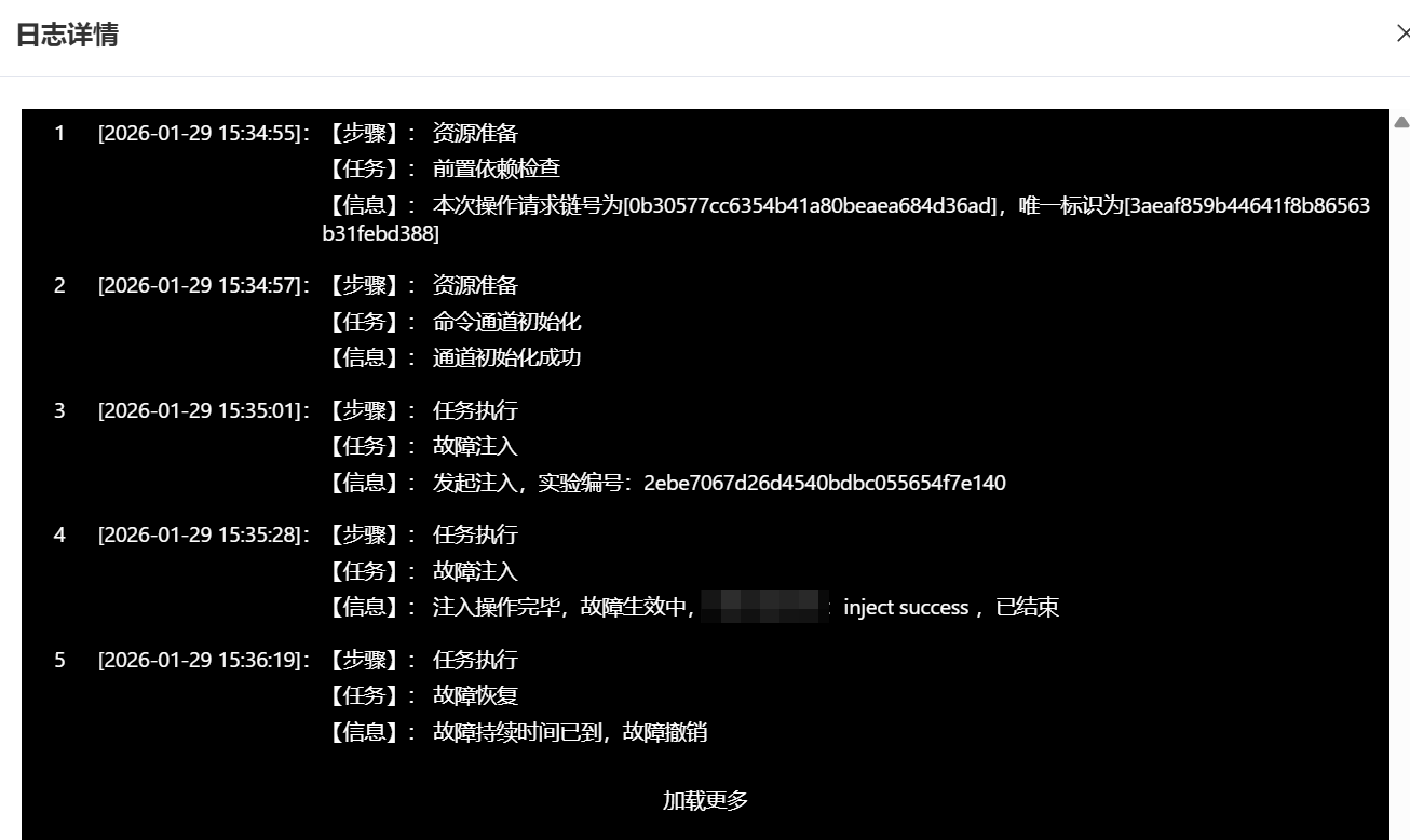 点击故障注入的节点,在右侧弹出的页面点击查看日志,查询本次故障注入的执行细节。