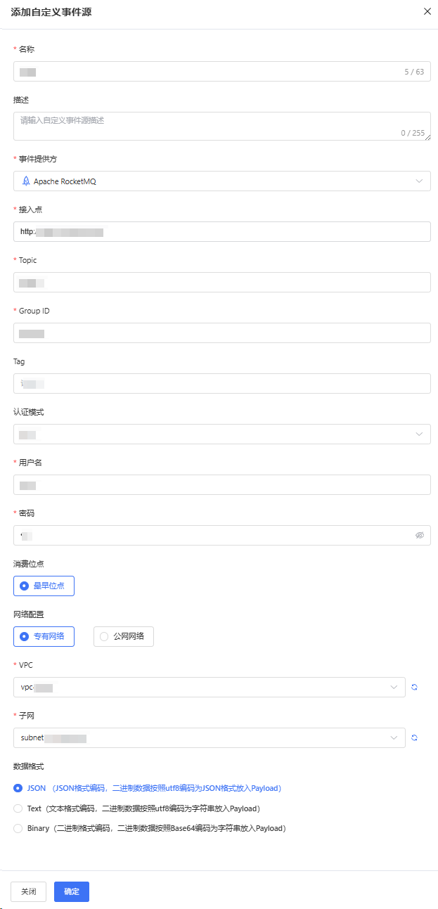 在添加自定义事件源面板,输入名称和描述,事件提供方选择自建Apache RocketMQ,配置相关参数,然后单击确认,如图1所示。