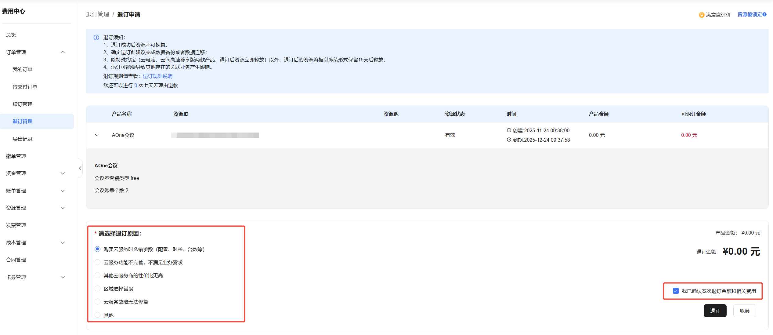 单击【订单管理】-【退订管理】,找到您要退订的订单,点击“退订”按钮,进入退订详情页面。