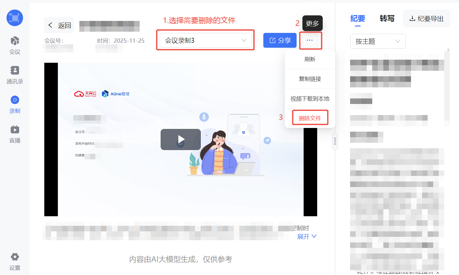 如果只需要删除该会议某一段或某几段云录制文件,需进入该云录制文件的详情页,选择需要删除的云录制文件后,再点击“···”->“删除文件”。
