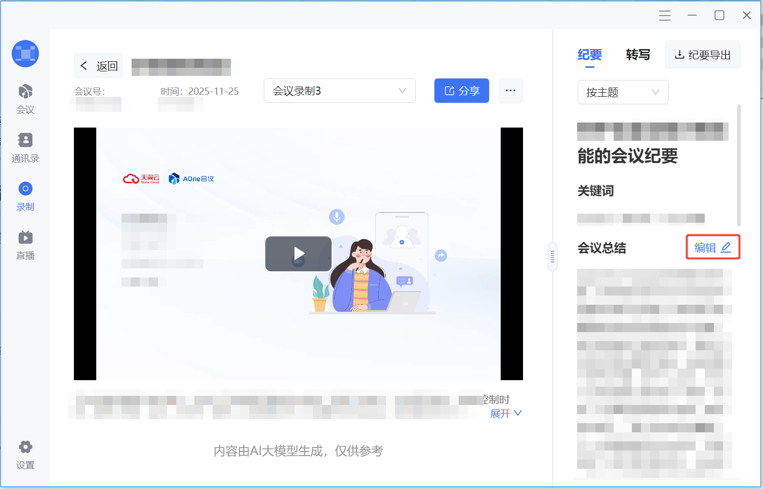 如果生成的智能会议纪要内容与您的预期不符,您可在纪要查看页面,将鼠标悬浮在计划修改的纪要段落上后,点击“编辑”按钮进行修改。