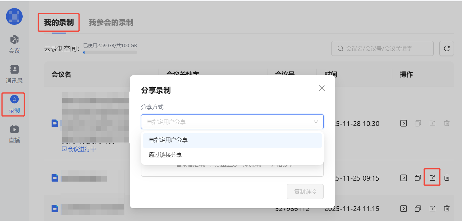云录制文件的默认分享方式为“与指定用户分享”,默认指定的用户范围为与创建者同企业的参会者。若需要修改分享配置,可点击“分享”按钮进行修改。如果需要将云录制文件分享给企业外的其他用户观看,需将分享方式修改为“通过链接分享”,用户即可通过访问密码进行查看。