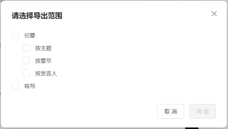 如果需要将会议纪要或转写文本下载到本地,则在云录制文件的详情页,点击右侧的“纪要导出”按钮,按需选择导出范围。纪要支持按主题、按章节、按发言人进行导出。