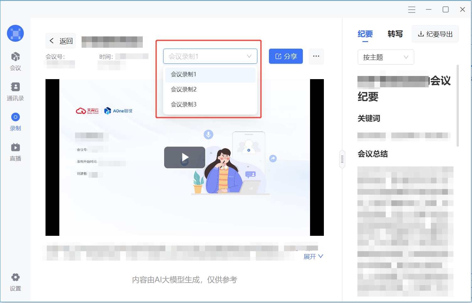 会议结束后,会议创建者可在会议客户端首页的“录制”>“我的录制”页面找到并管理已生成的云录制文件。点击会议名称或播放按钮,可以查看云录制视频、会议转写内容。如果会议中有多次开启和结束云录制,会生成多段录制文件,可点击“分享”按钮左侧的下拉框进行切换查看。