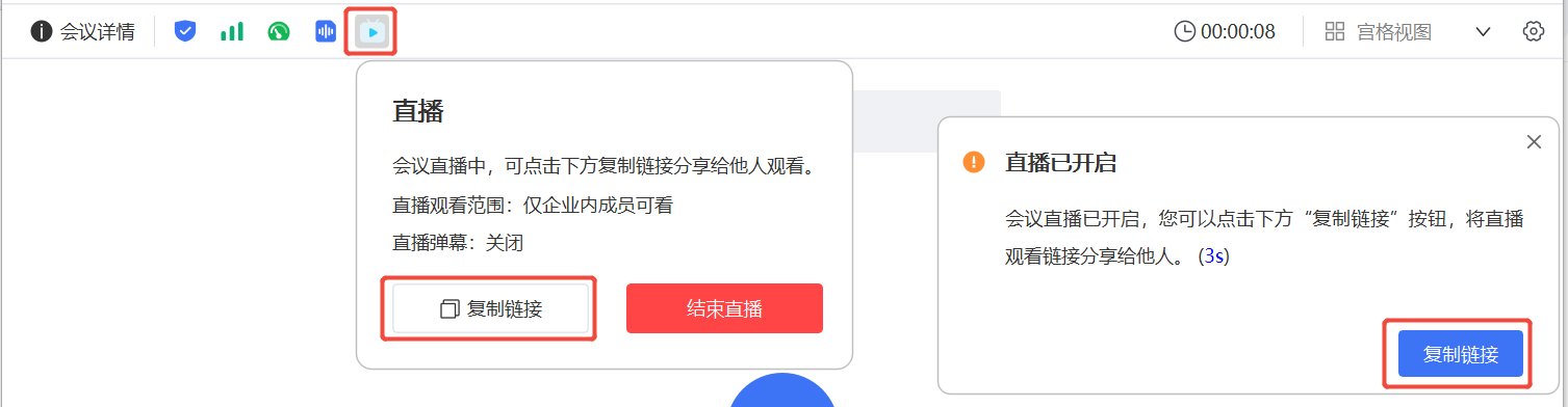 直播开启后,系统会自动生成直播观看链接,并弹窗提醒直播发起者。直播发起者可直接点击弹窗中的“复制链接”按钮将直播观看链接信息分享给目标观众。在直播过程中,会议主持人/联席主持人也可通过将鼠标悬浮在窗口左上角的直播图标上,点击“复制链接”按钮获取直播观看链接信息。