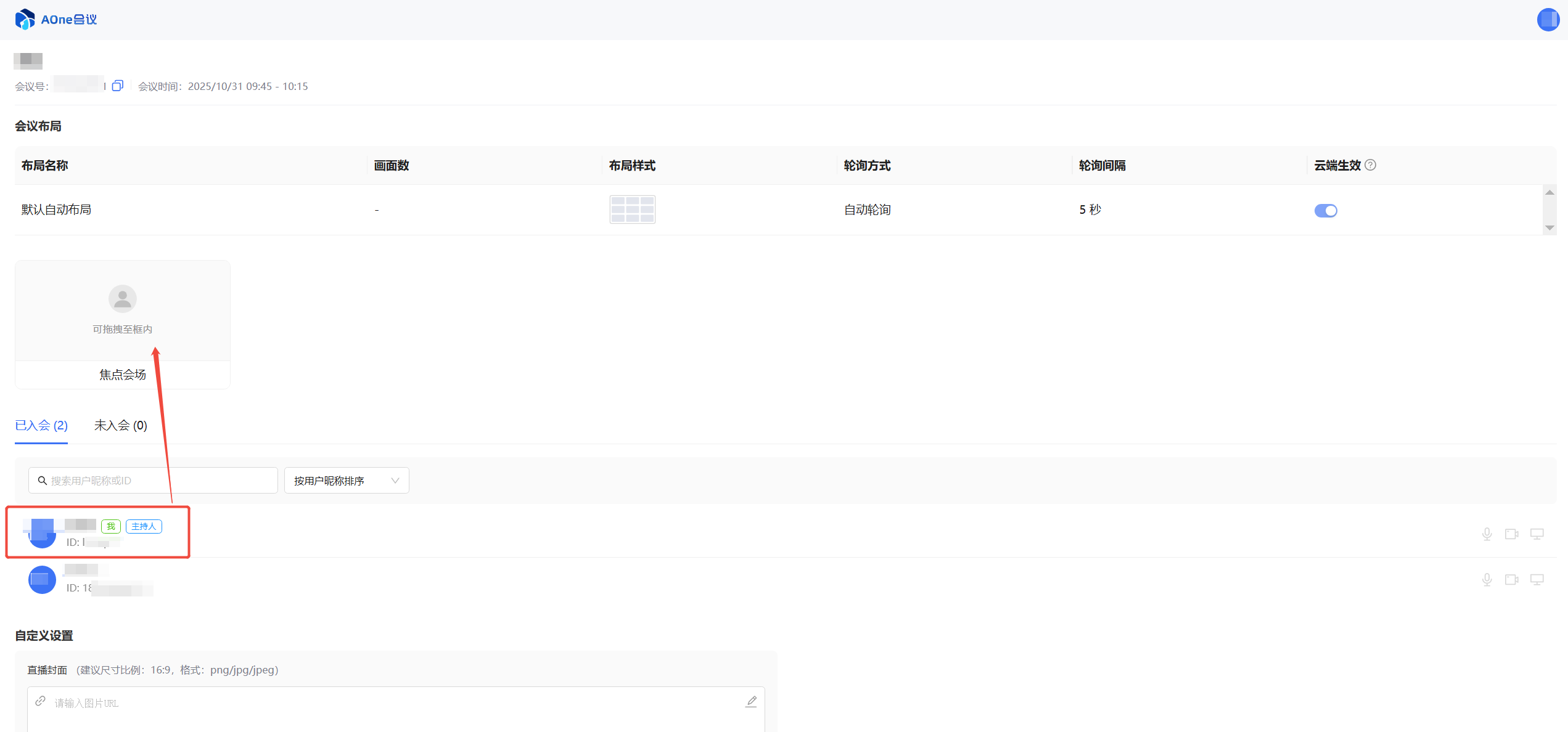 - 在会议布局区域,选择您需要设置为焦点画面的“已入会”用户,直接将其拖拽到框内即可。