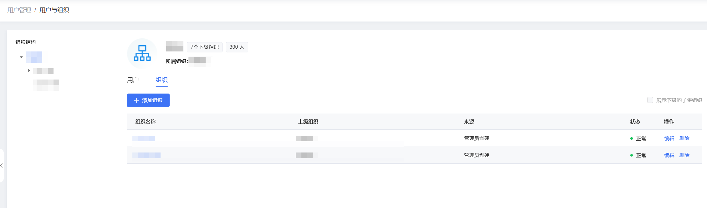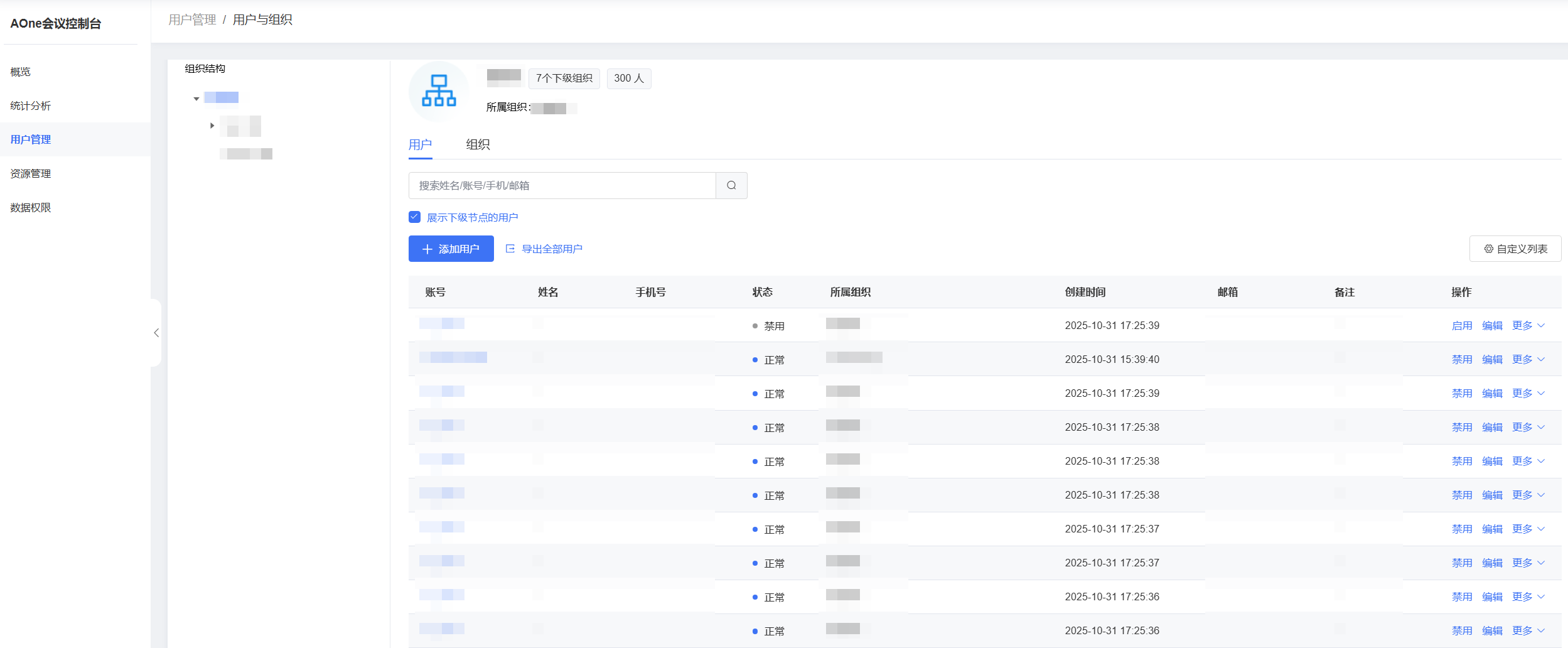 在控制台选择【用户管理】,可查看并管理用户和组织信息。当前控制台暂不支持批量导入用户和组织信息,如需批量导入,请联系客户经理或提交工单处理。