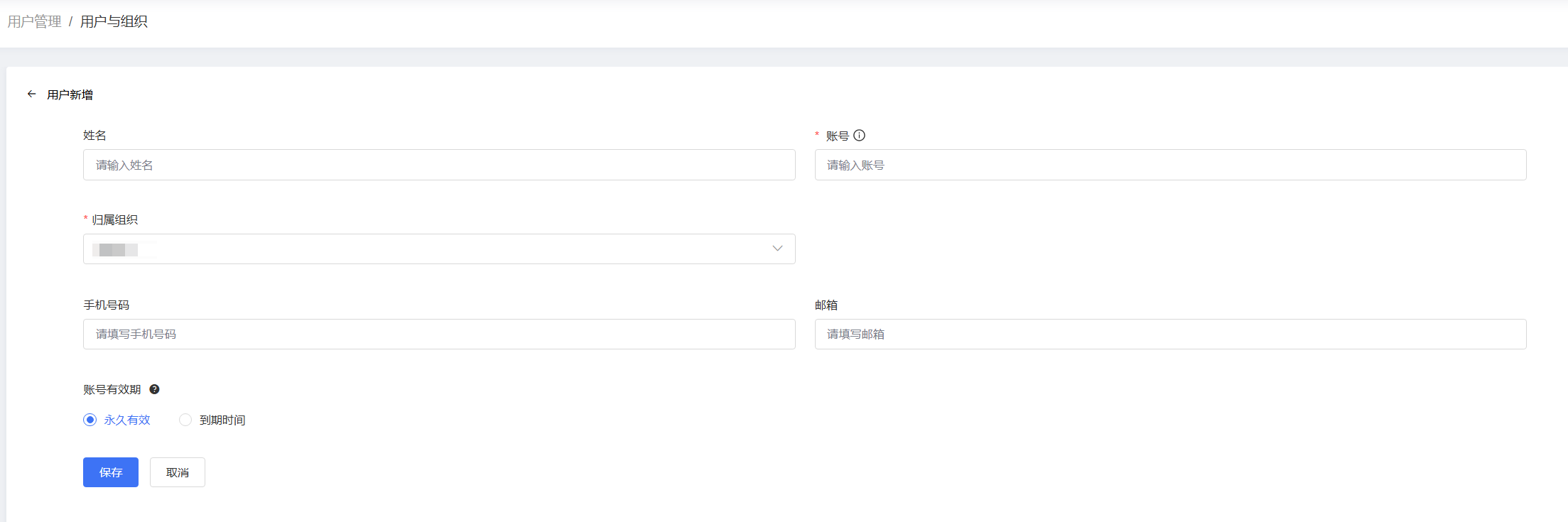 | 账号有效期 | 非必填,若未选择,则默认是永久有效,可选择账号到期时间,在到期时间之后,该账号将被设置为禁用状态,被禁用的账号在登录后将进行拦截,需重新设置有效期,其账号状态才变成启用。若是被手动禁用的账号,在账号有效期过期后,除重新设置有效期外,还需手动进行账号启用。 |