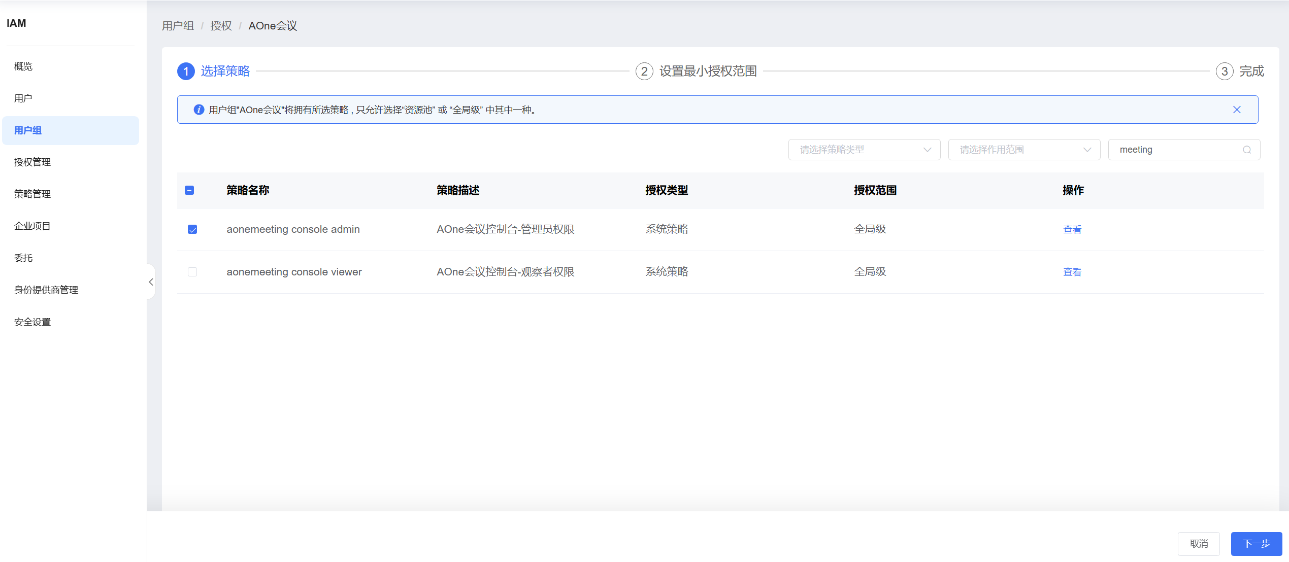AOne会议控制台-观察者权限:策略名称为aonemeeting console viewer,拥有对AOne会议控制台的全局只读权限,无法执行任何管理操作。
