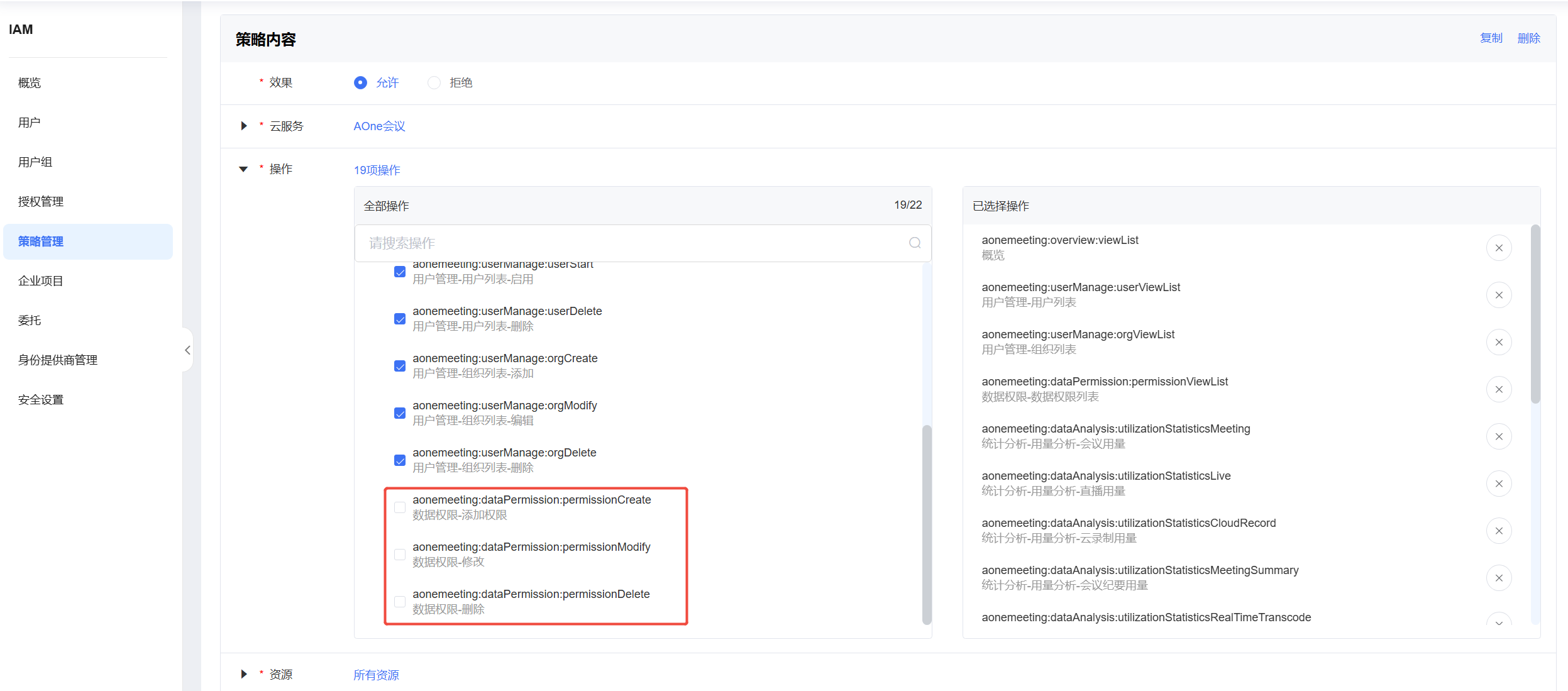 如果默认策略无法满足需求,您可以通过【策略管理】页面,创建自定义策略,进行更精细的功能权限控制。策略内容中的“云服务”选择AOne会议,“操作”按需选择。需注意,如果分配了数据权限的写权限操作,则使用该策略的用户组的用户,将具备为其他用户分配和修改AOne会议控制台数据权限的能力。
