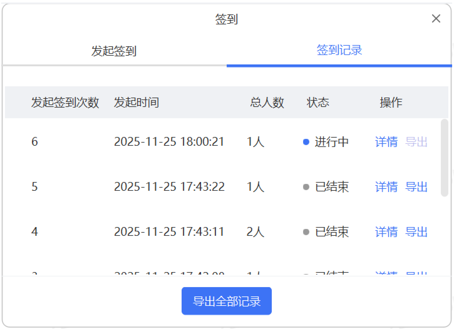 会议结束后,会议创建者可以通过历史会议详情查看或导出完整的签到记录数据。