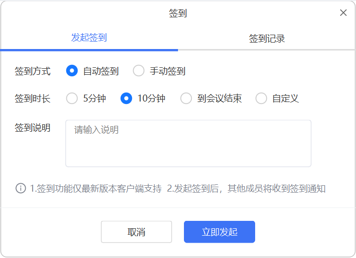 手动签到:签到开启后会弹窗通知参会者,参会者需手动点击完成签到,主持人与联席主持人系统会自动签到。