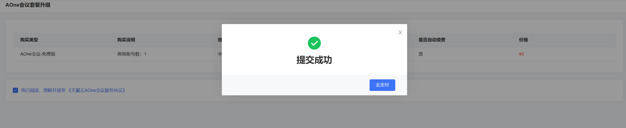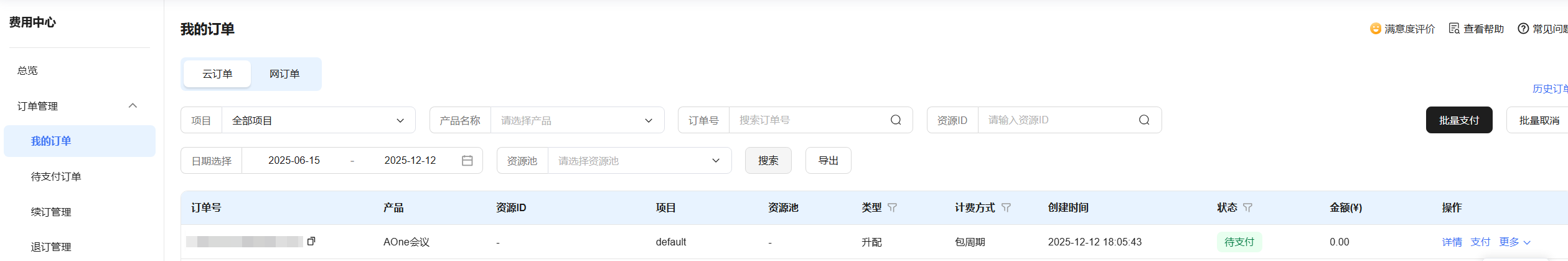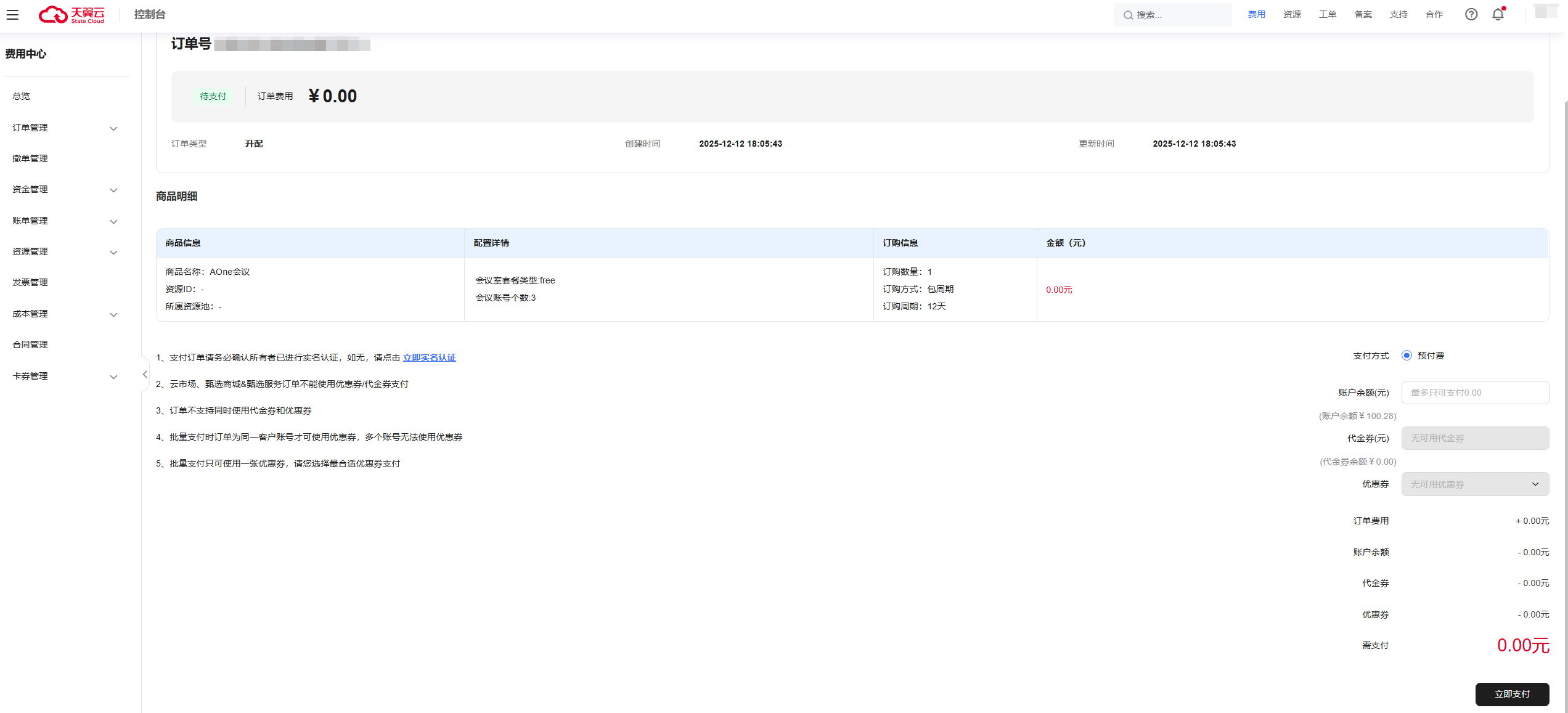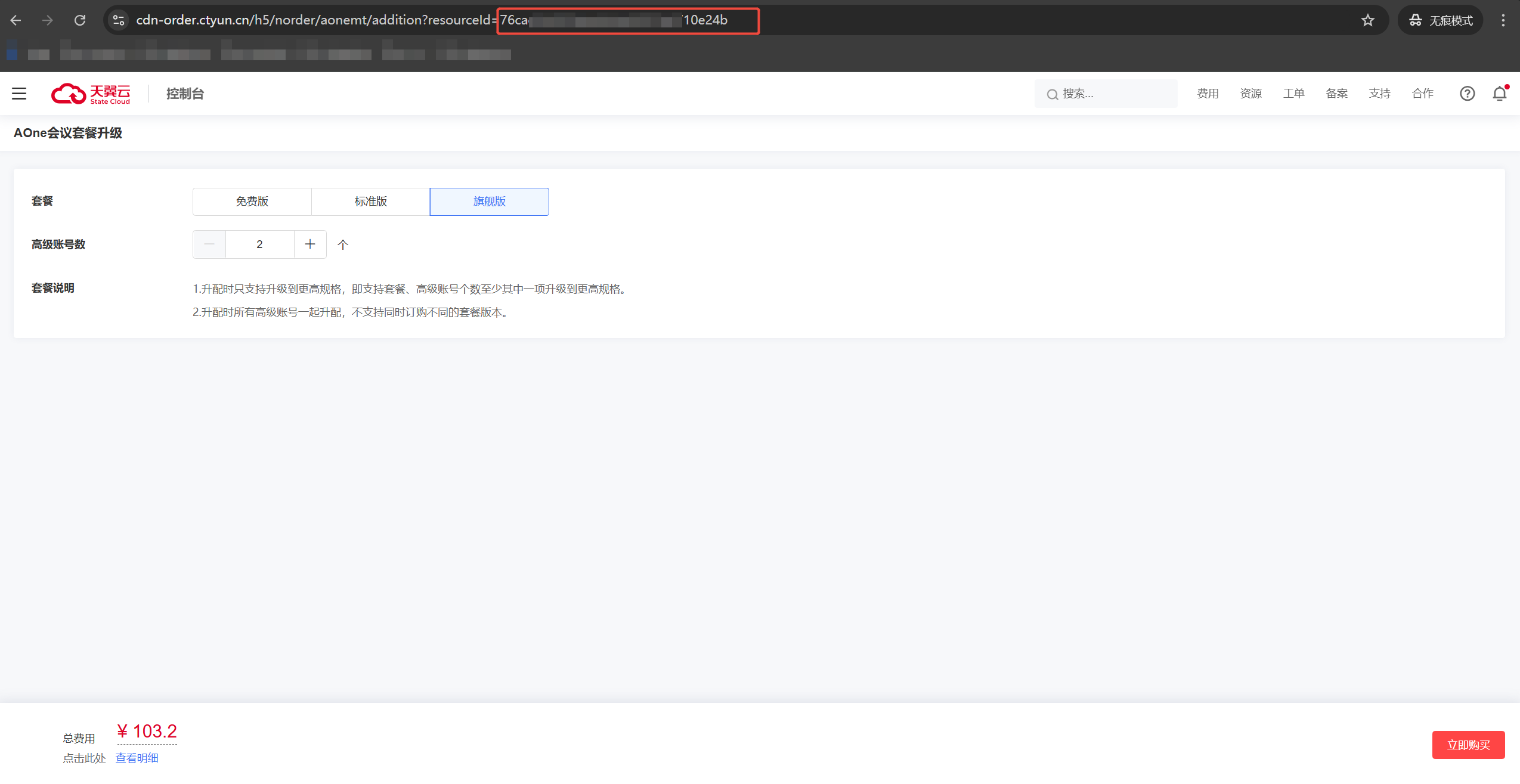 访问AOne会议套餐升级页面,页面地址为:https://cdn-order.ctyun.cn/h5/norder/aonemt/addition?resourceId=资源ID,需要先用步骤2中复制的资源ID字符串替换URL地址中的资源ID中文,再访问。如有疑问,可下工单咨询处理。