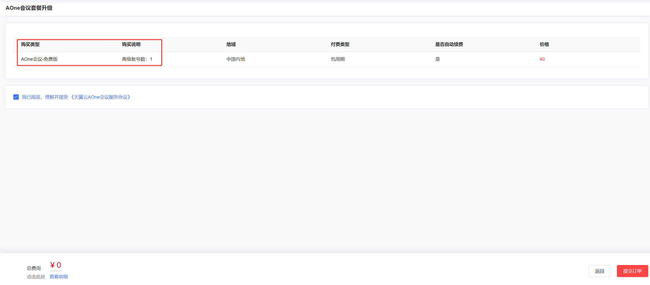 按需选择要升级的套餐与高级账号数,点击“立即购买”。核对购买类型和购买说明无误后,再点击右下角的“提交订单”。