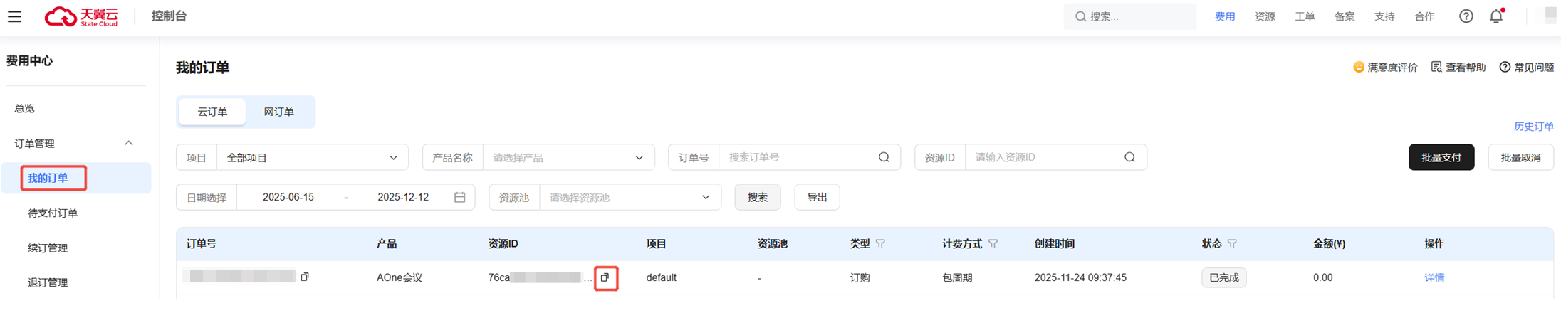 单击【订单管理】-【我的订单】,找到您要升级的订单,点击“资源ID”字段旁边的“复制”按钮,获取该订单的资源ID信息。