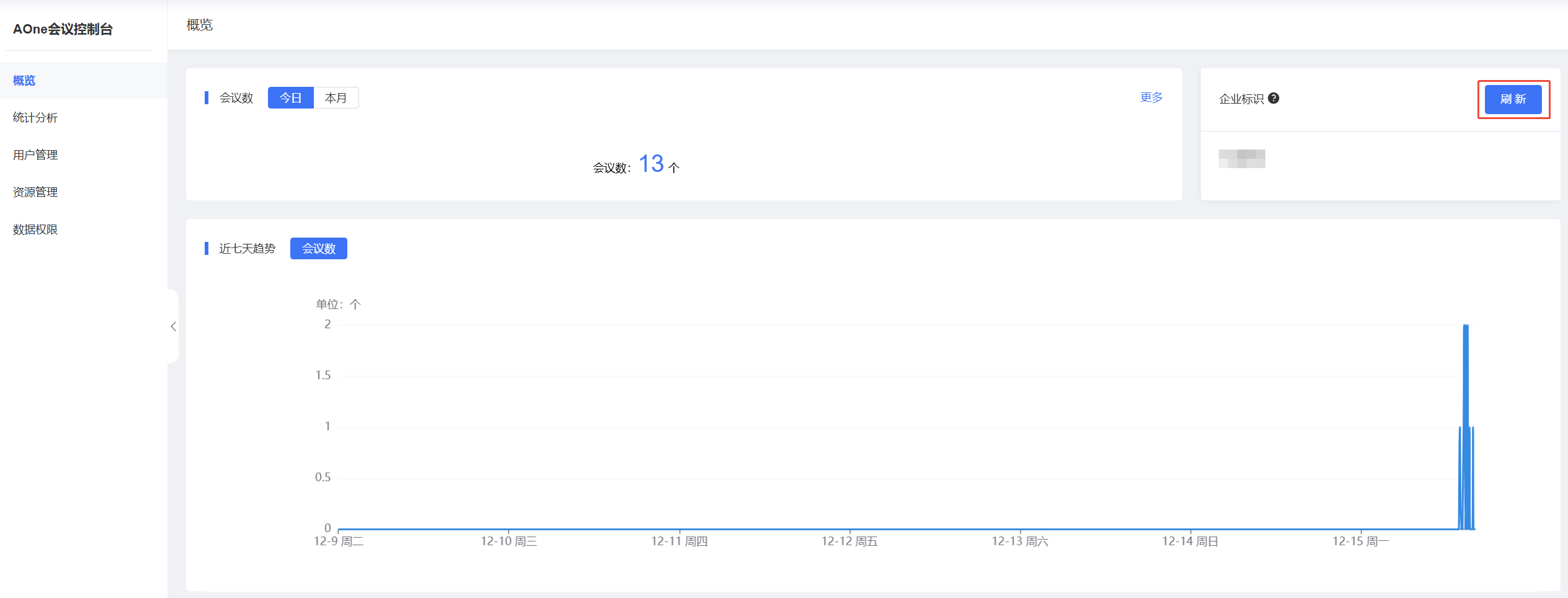 企业标识设置完成后,在控制台概览页即可查看企业标识信息。若企业标识有变更,但页面显示未更新,可点击企业标识右侧的“刷新”按钮,进行配置更新。