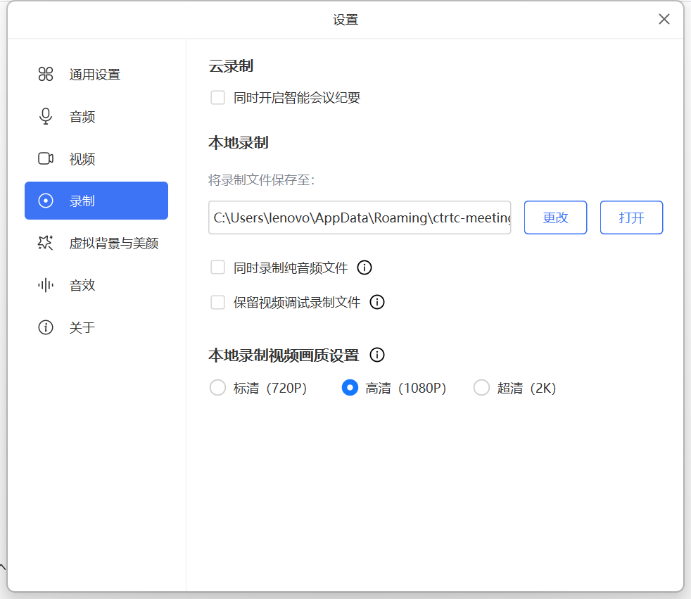会议录制者可在会议客户端首页的“设置”>“录制”>“本地录制”找到本地录制存储路径,查看和管理本地录制视频。