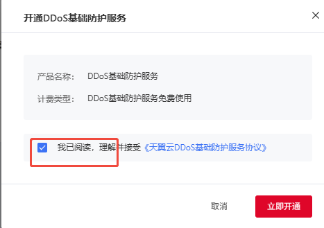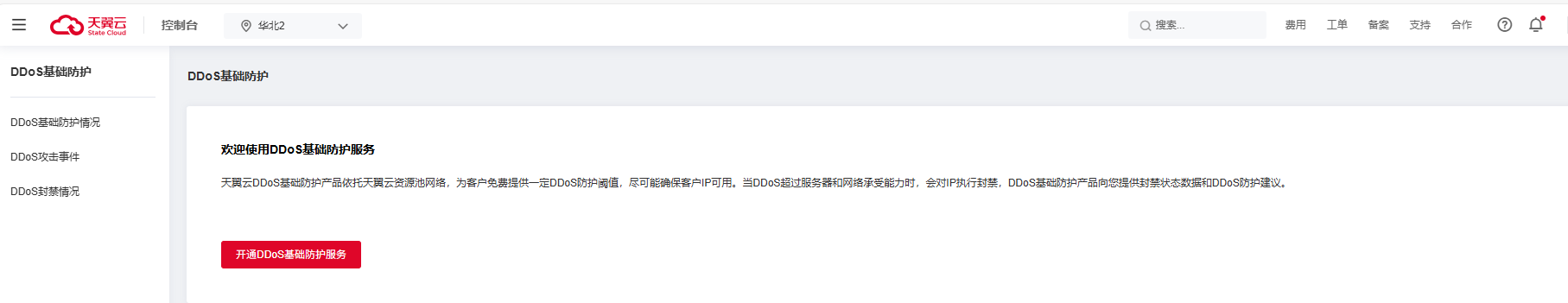 选择“安全及管理 > 网络安全 > DDoS基础防护”,进入 DDoS基础防护控制台页面。点击“开通DDoS基础防护服务”。