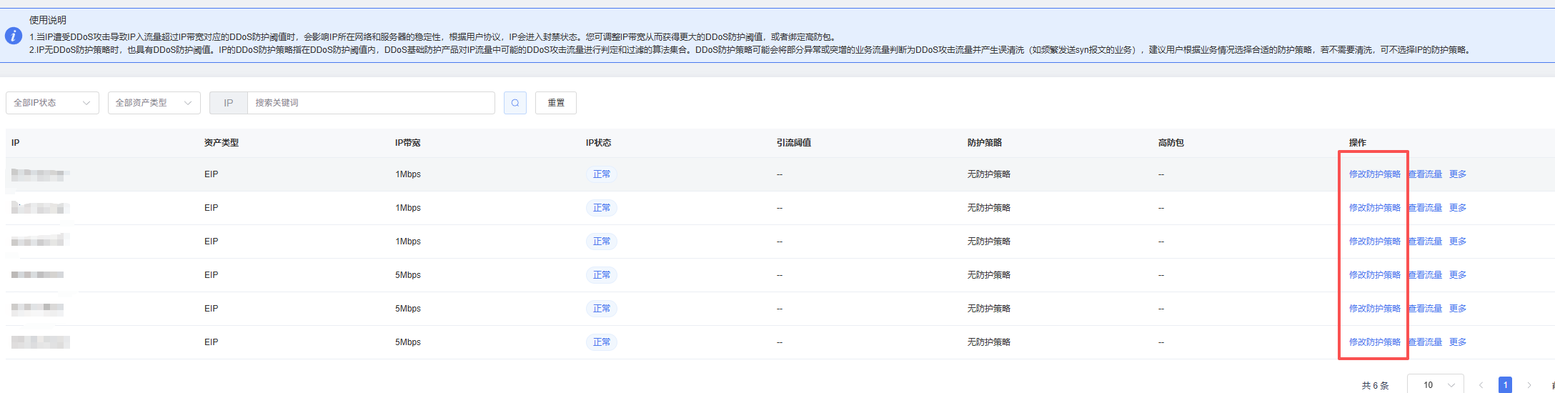 3. 进入资产中心页面,在操作一列点击“修改防护策略”,调整IP的防护策略。默认可选的几种防护策略的名称代表策略适合防护的攻击大小,如5G防护策略代表适合防护5Gbps左右的流量和DDoS攻击,对规模更小的流量,可能不会清洗,直接放过该部分流量。建议您根据业务带宽大小,选择与业务带宽上限大小等同的防护策略,例如300Mbps带宽的IP适合选择300Mbps防护策略。