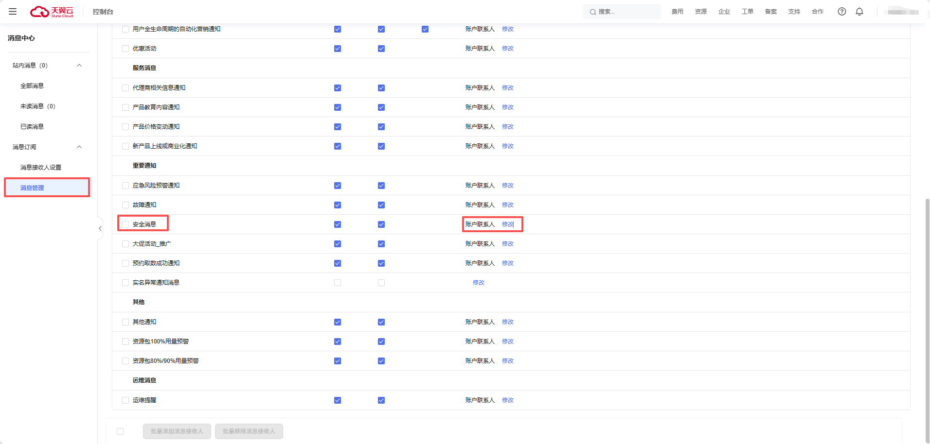 4.进入消息订阅的消息管理,将新增的消息接收人配置到安全消息一行中。