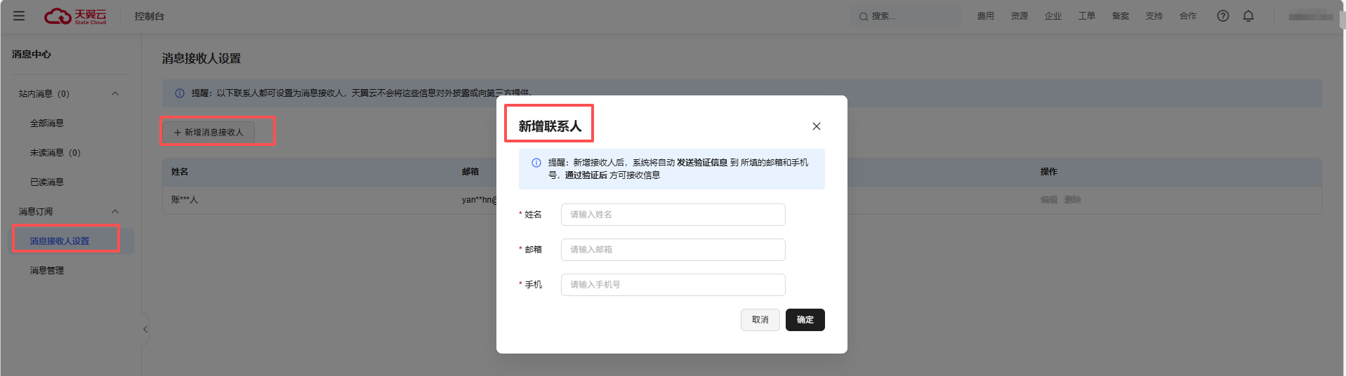 为确保您能及时获知弹性 EIP 的 DDoS 封堵相关信息,快速响应并保障业务平稳运行,本文将详细介绍 DDoS 封堵通知渠道的配置方法。默认情况下,当 IP 触发 DDoS 封堵时,平台会自动向您天翼云账号本身已绑定的联系人,通过短信、站内信、邮件三种方式发送封堵通知;若您需要让业务值班人员、运维人员等更多相关人员同步接收该类通知,可通过配置安全消息接收人的方式额外增加接收人,实现 DDoS 封堵信息的多人同步推送,具体配置操作将在下文逐步说明。