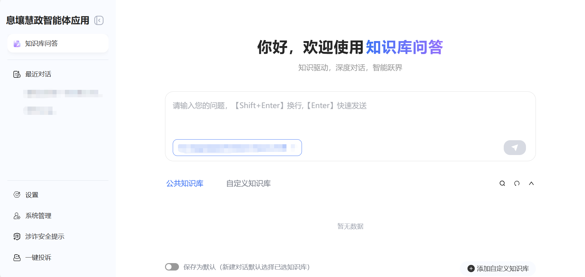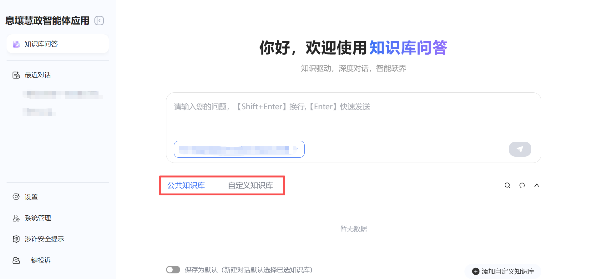 知识库选择:用户可以从【公共知识库】和【自定义知识库】中选定内容(可同时选择公共与自定义知识库内容)作为指定检索范围,以便基于指定知识库的内容进行回答。
