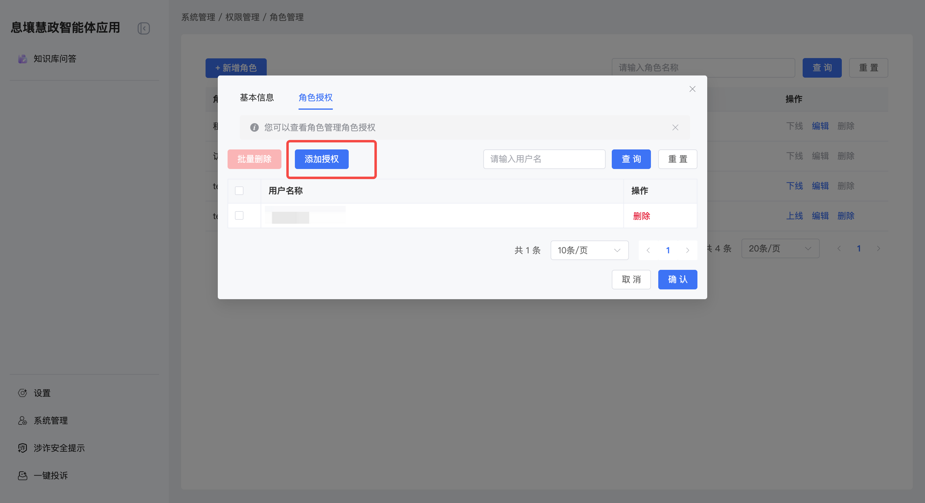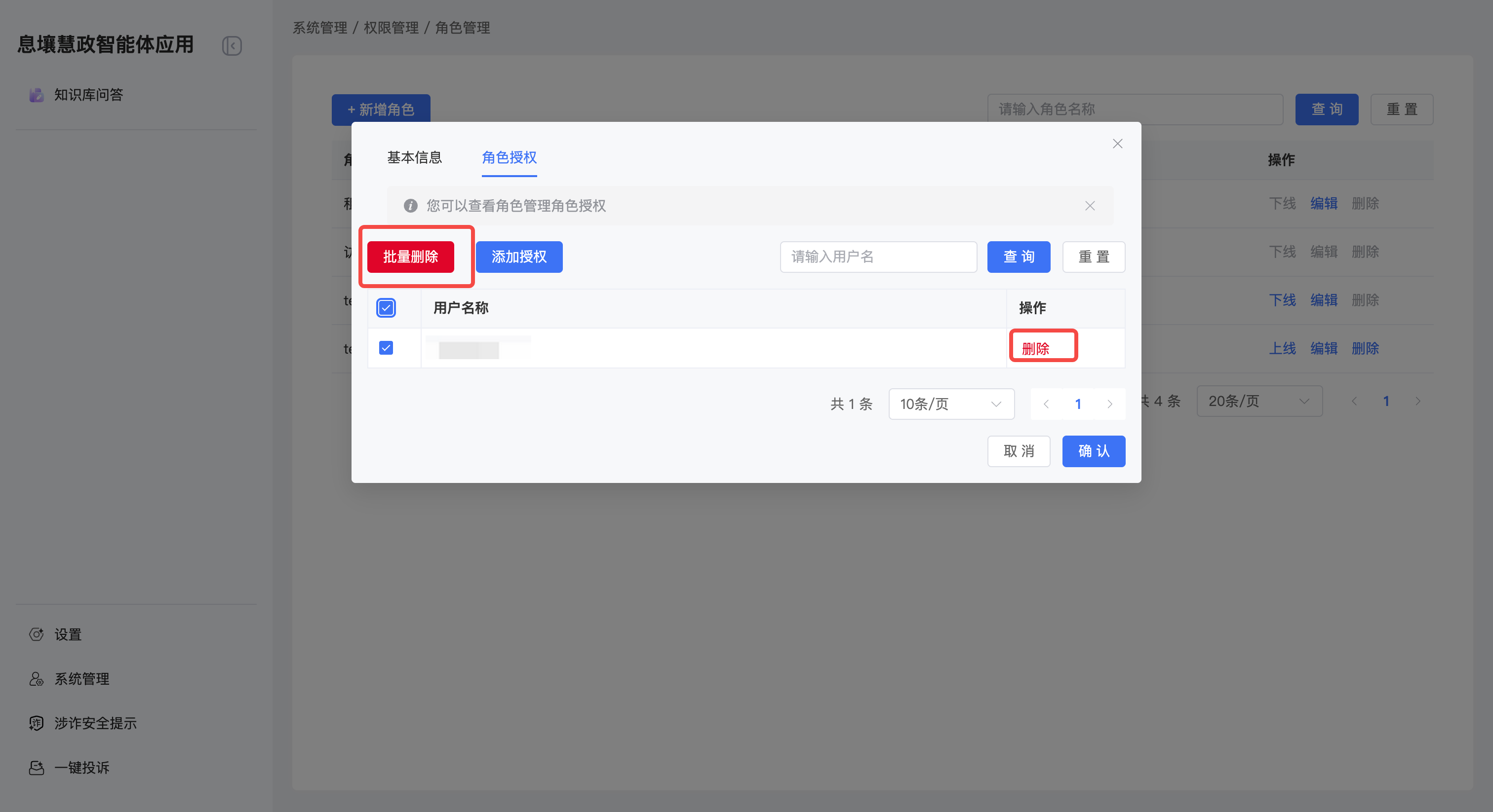 点击操作栏中的【删除】按钮以取消角色授权,或勾选想要取消授权的用户,点击左上角的【批量删除】。