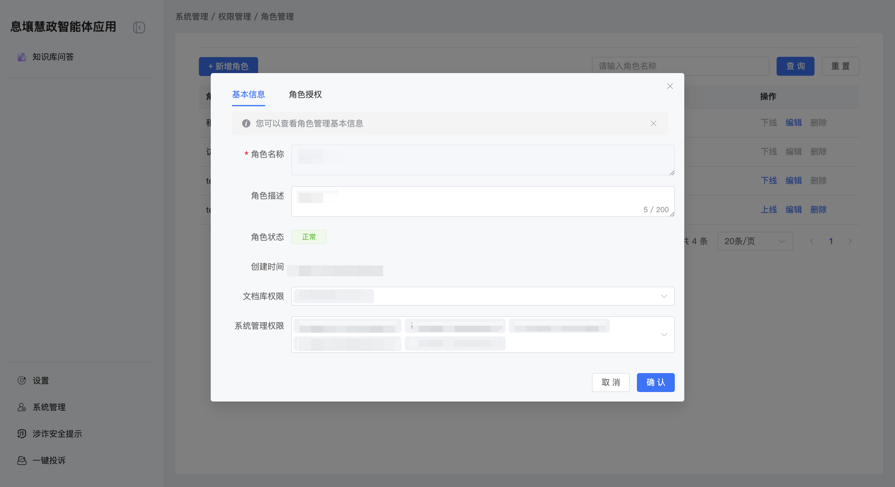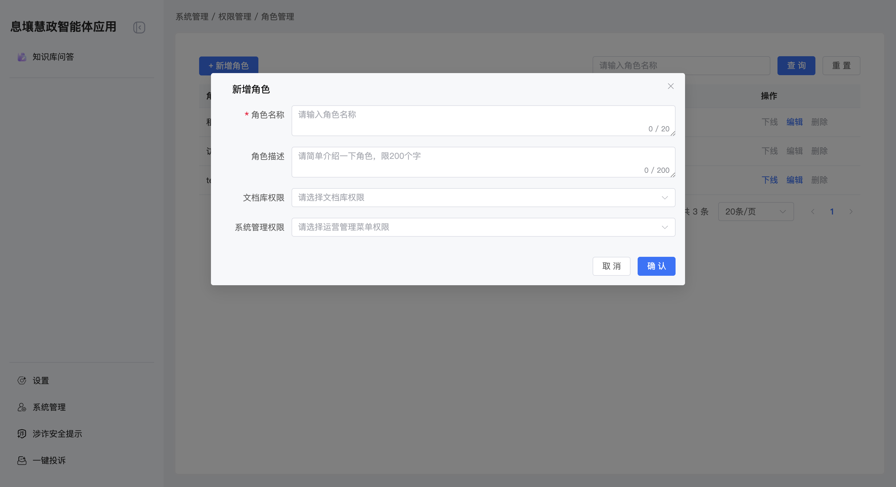 2.在弹窗中填写角色名称、角色描述、文档库权限、系统管理权限配置。