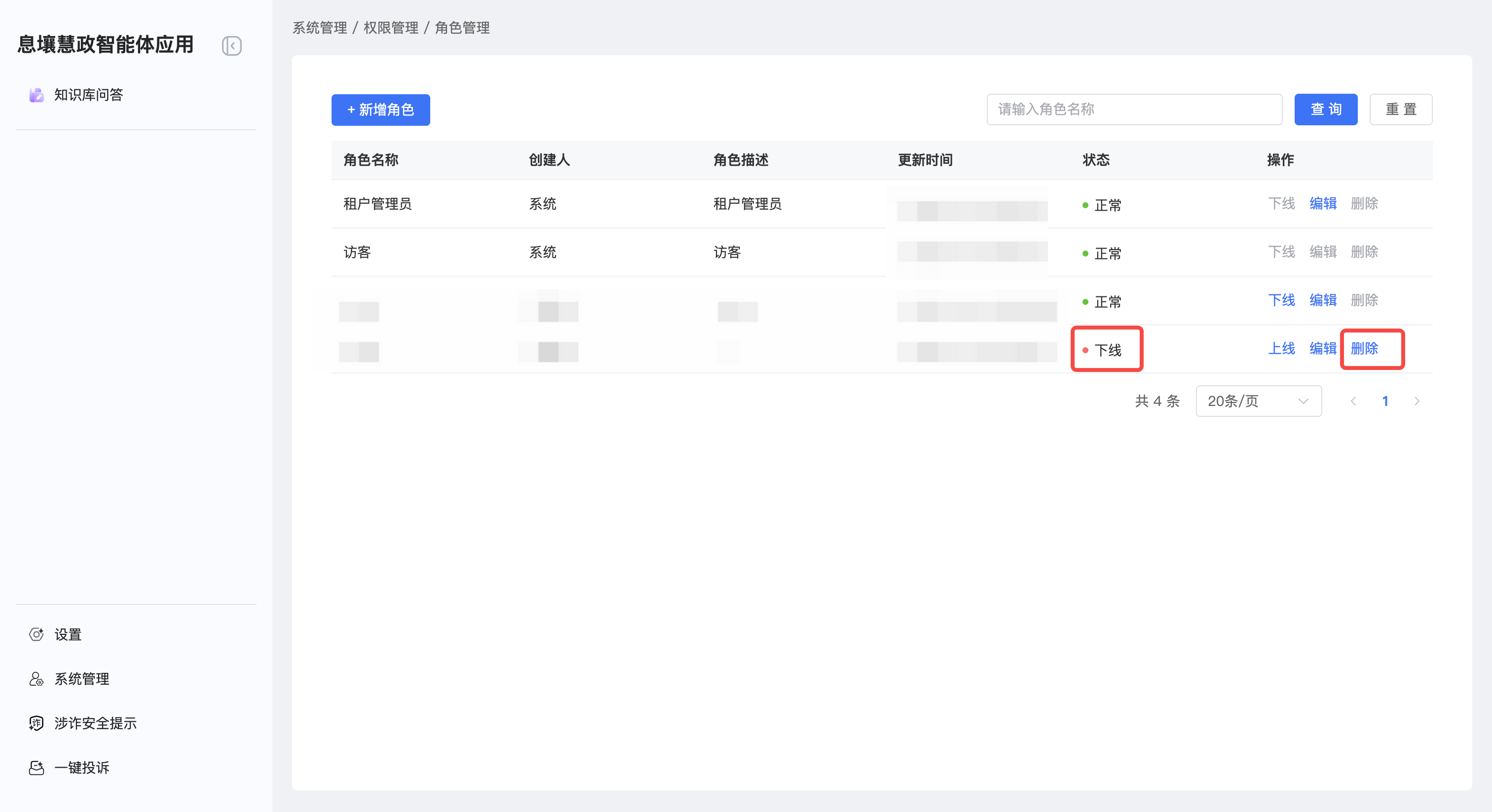 2.角色状态变为下线后,点击操作栏中的【删除】按钮。