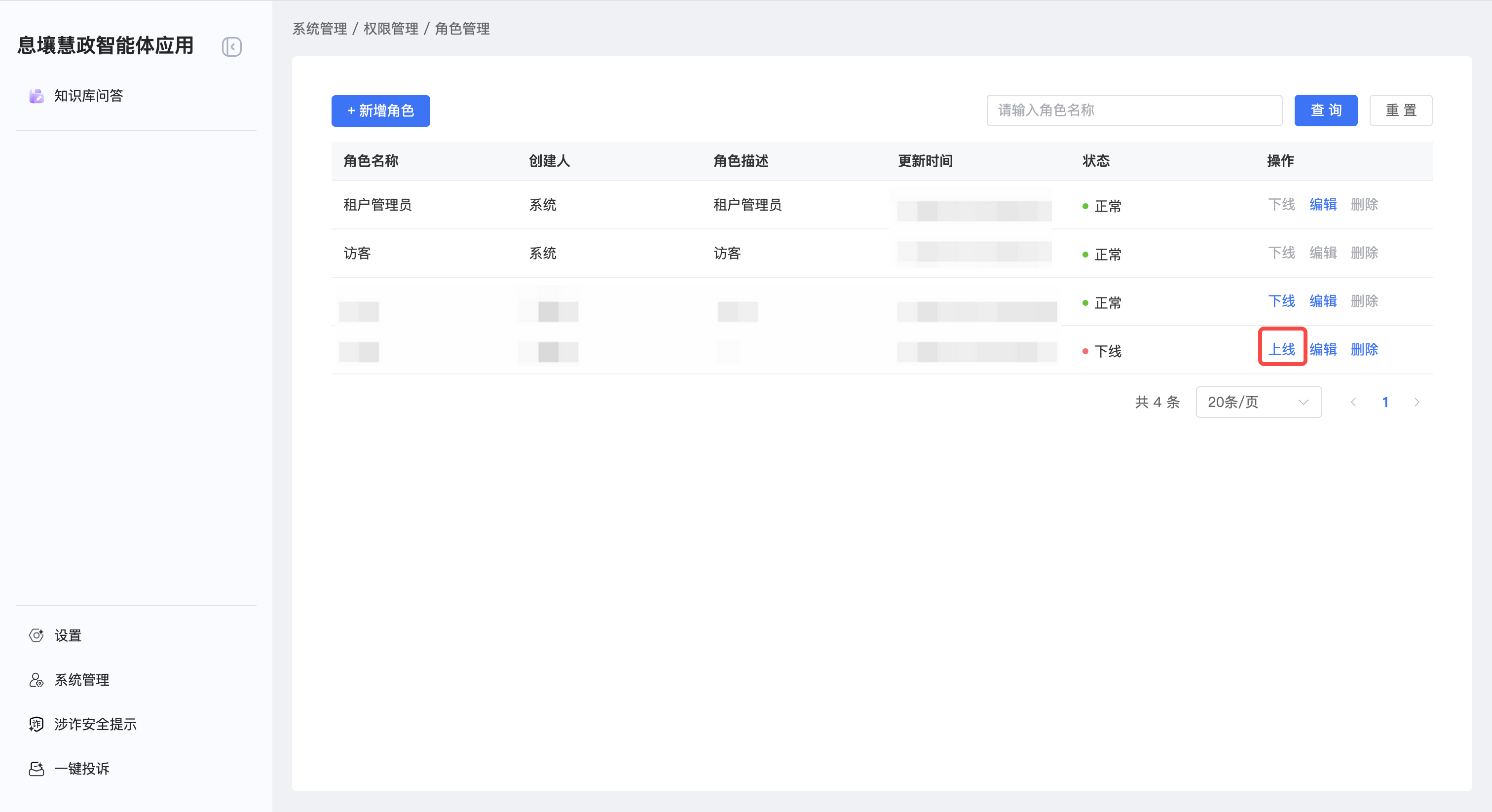 3.点击【确认】提交后,再点击操作栏中的【上线】按钮,即完成角色的新增与上线。