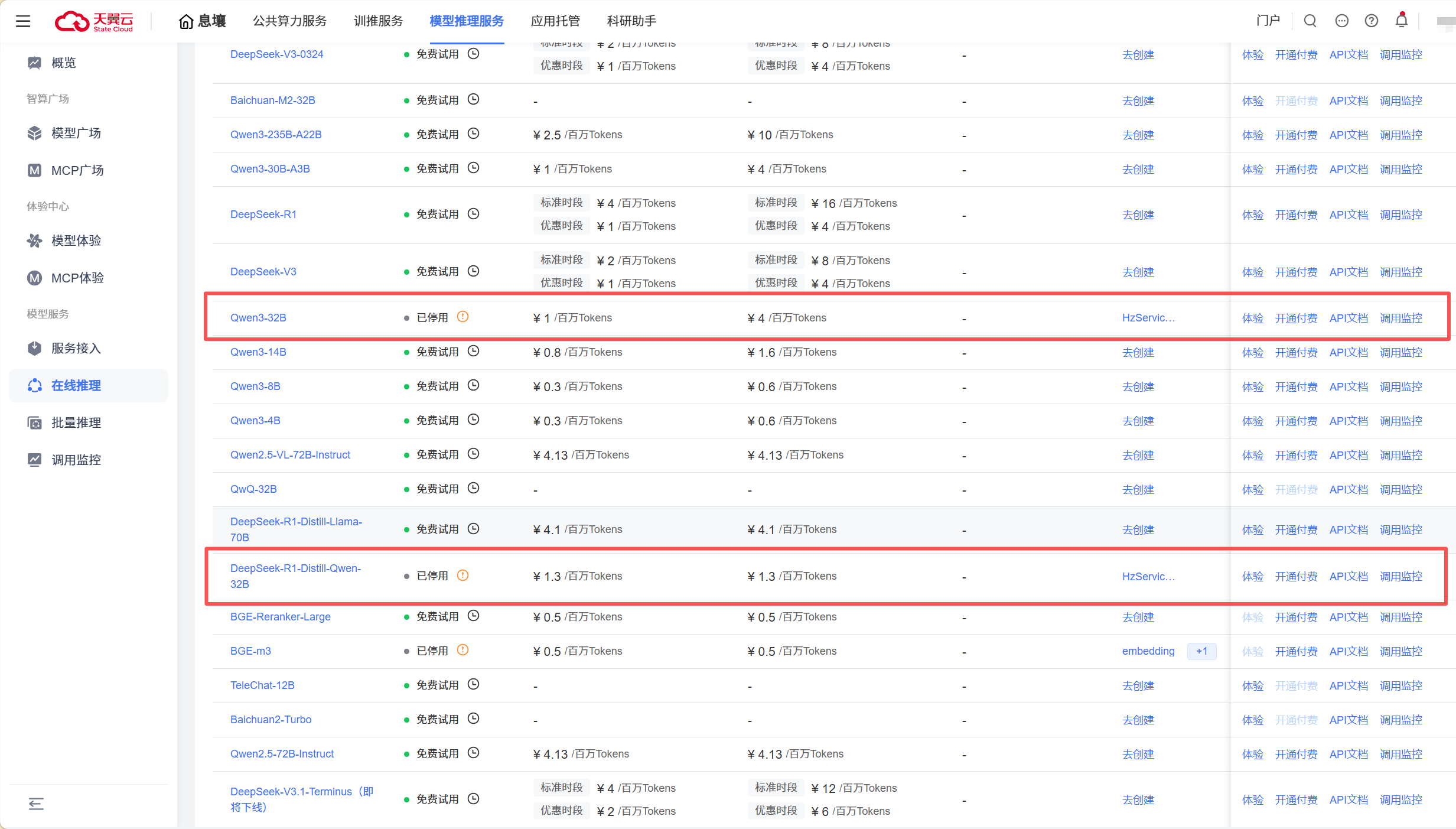 产品公测阶段使用的模型服务免费额度由“息壤模型推理服务平台”提供。进入“模型推理服务平台”- 在线推理,可以对使用的模型服务进行开通付费。