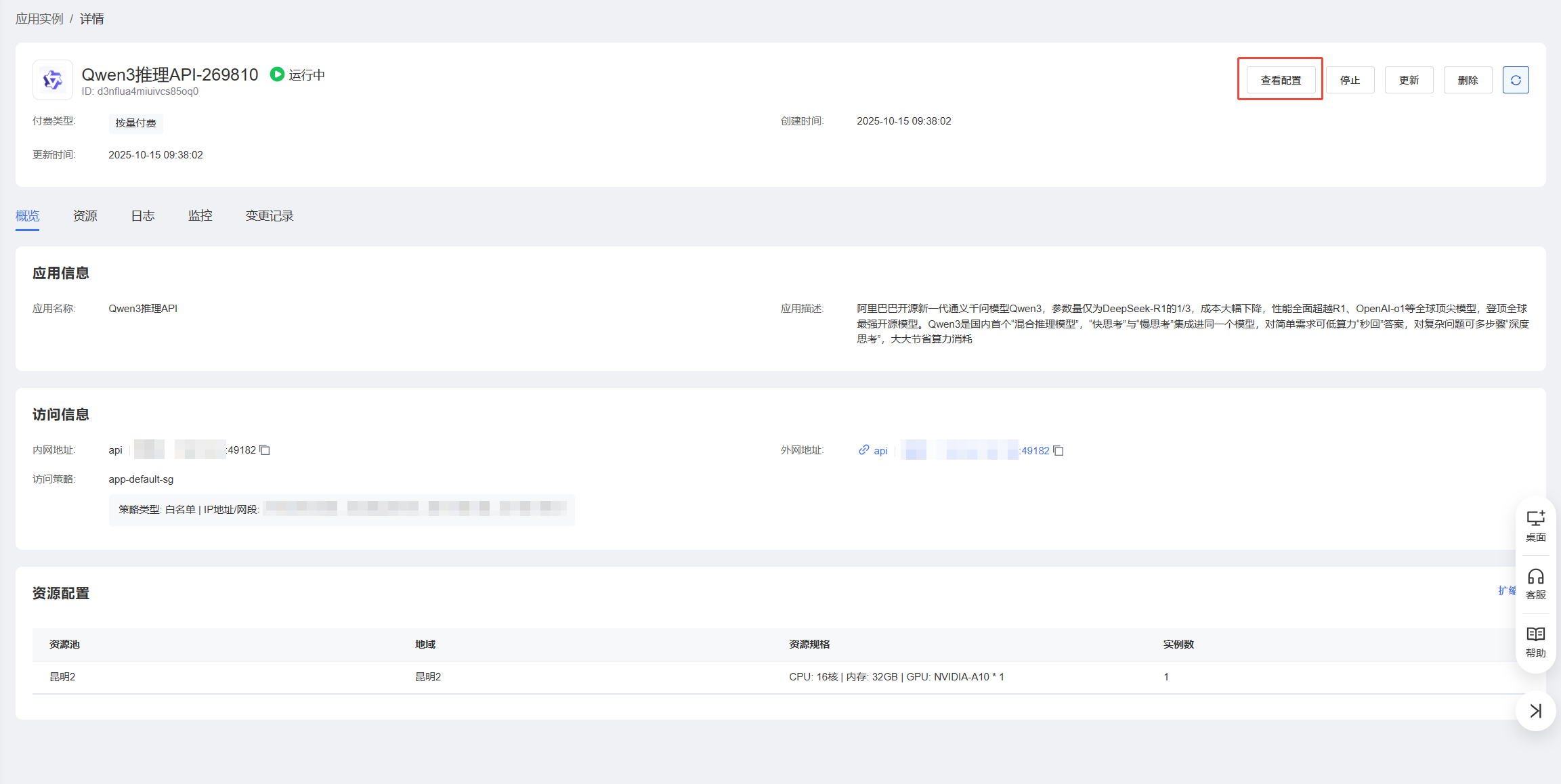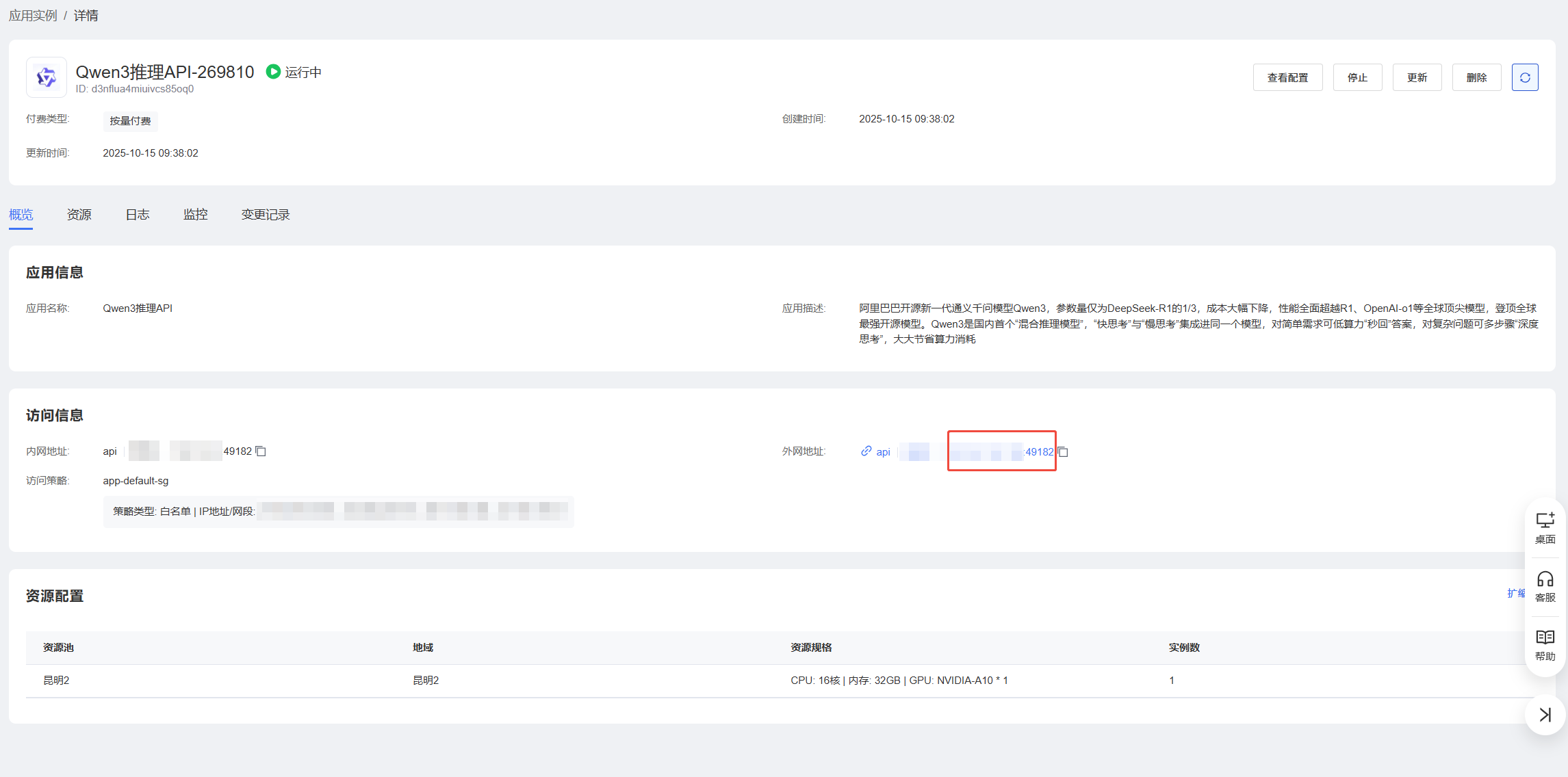 API调用地址(base_url):在应用托管租户控制台,进入【应用实例】,进入应用详情,在访问信息模块,获取"外网地址”,API调用地址格式为“http://{外网地址}/v1/”