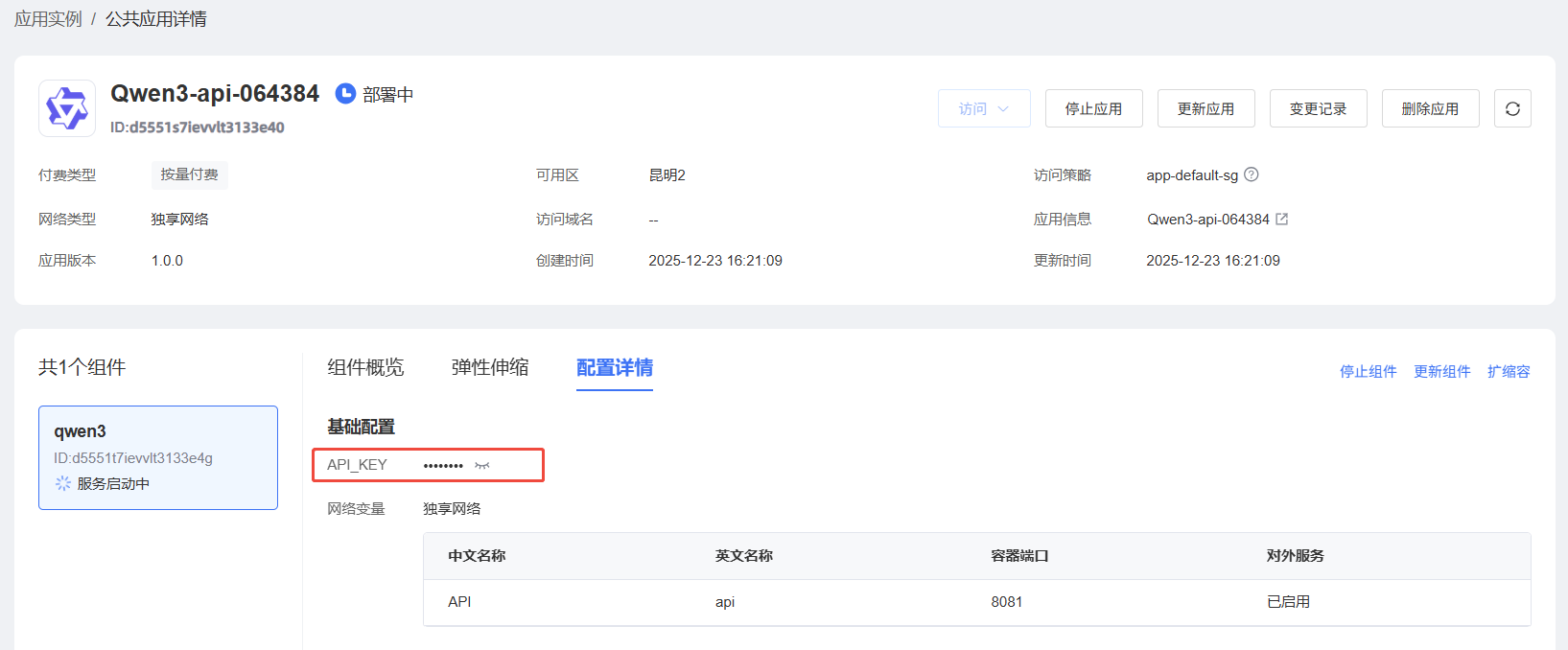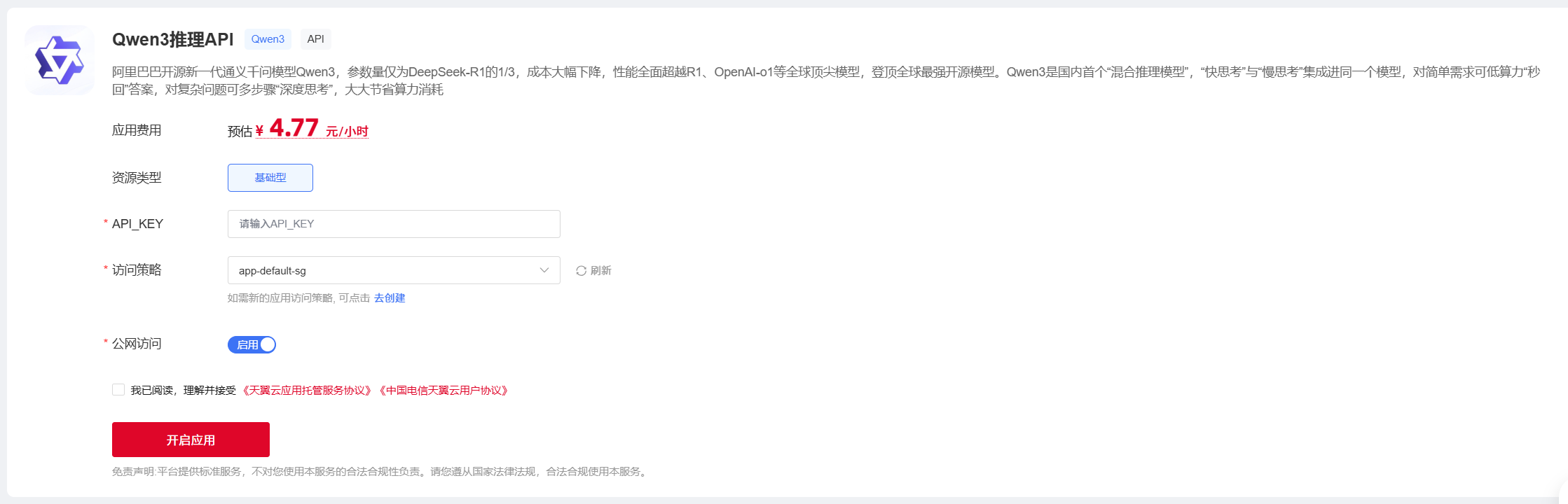 输入API_KEY,选择访问策略及公网访问,勾选同意用户协议,点击【开启应用】,支付订单,即可完成Qwen3服务部署。