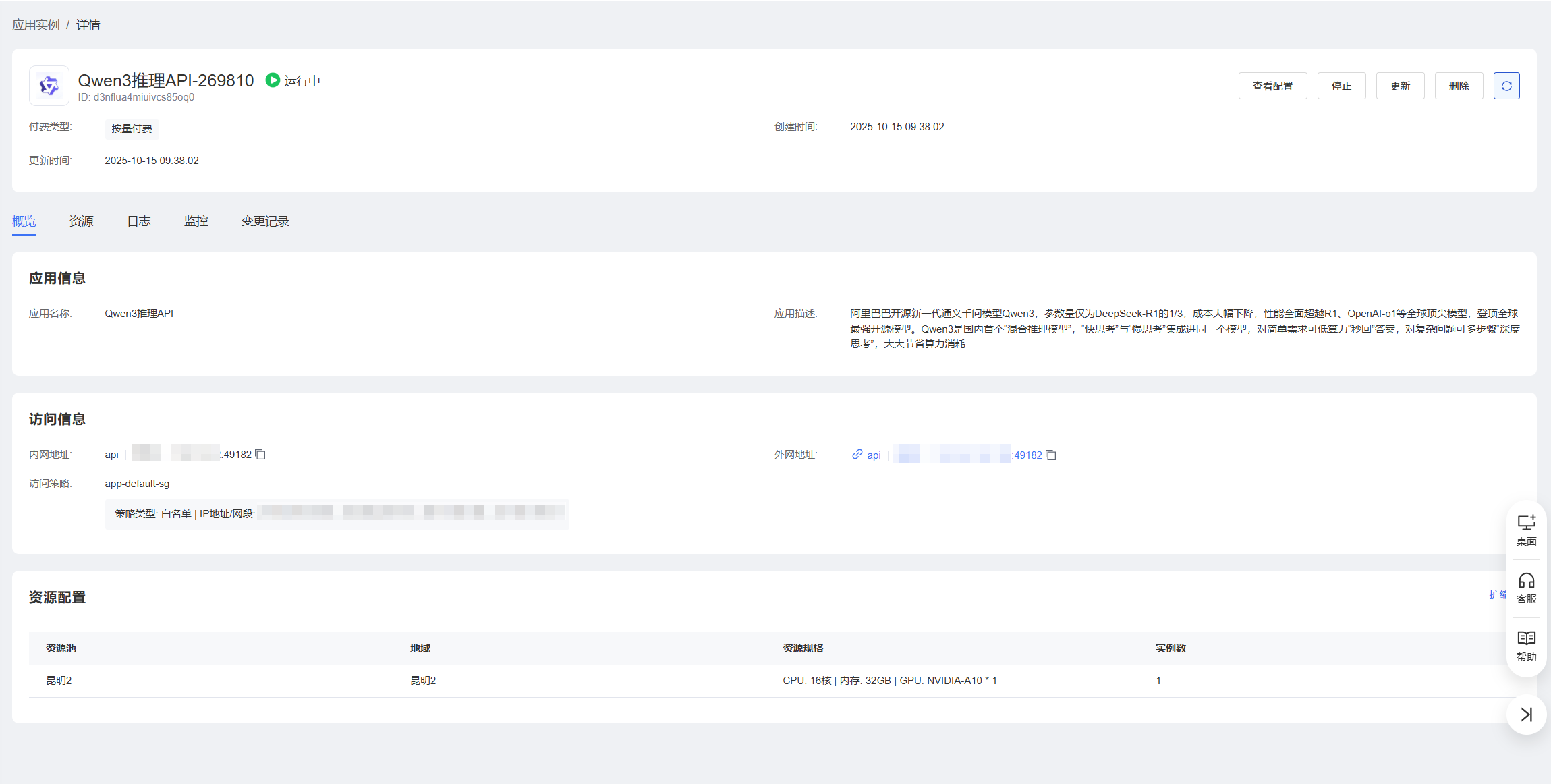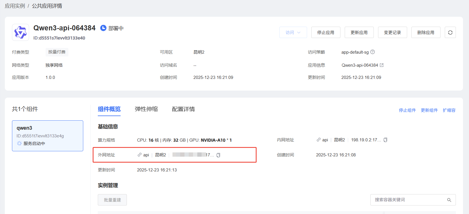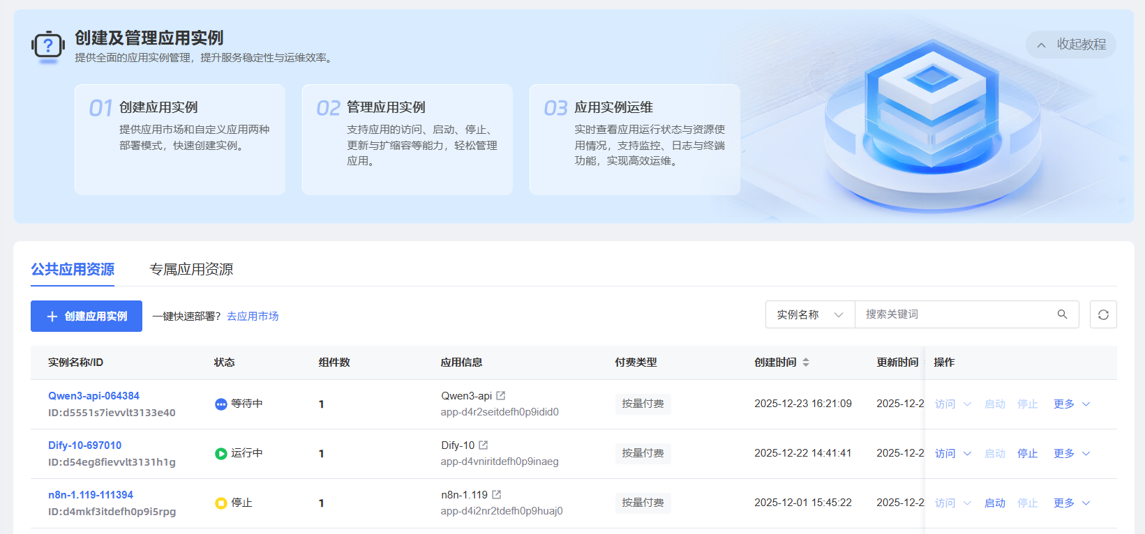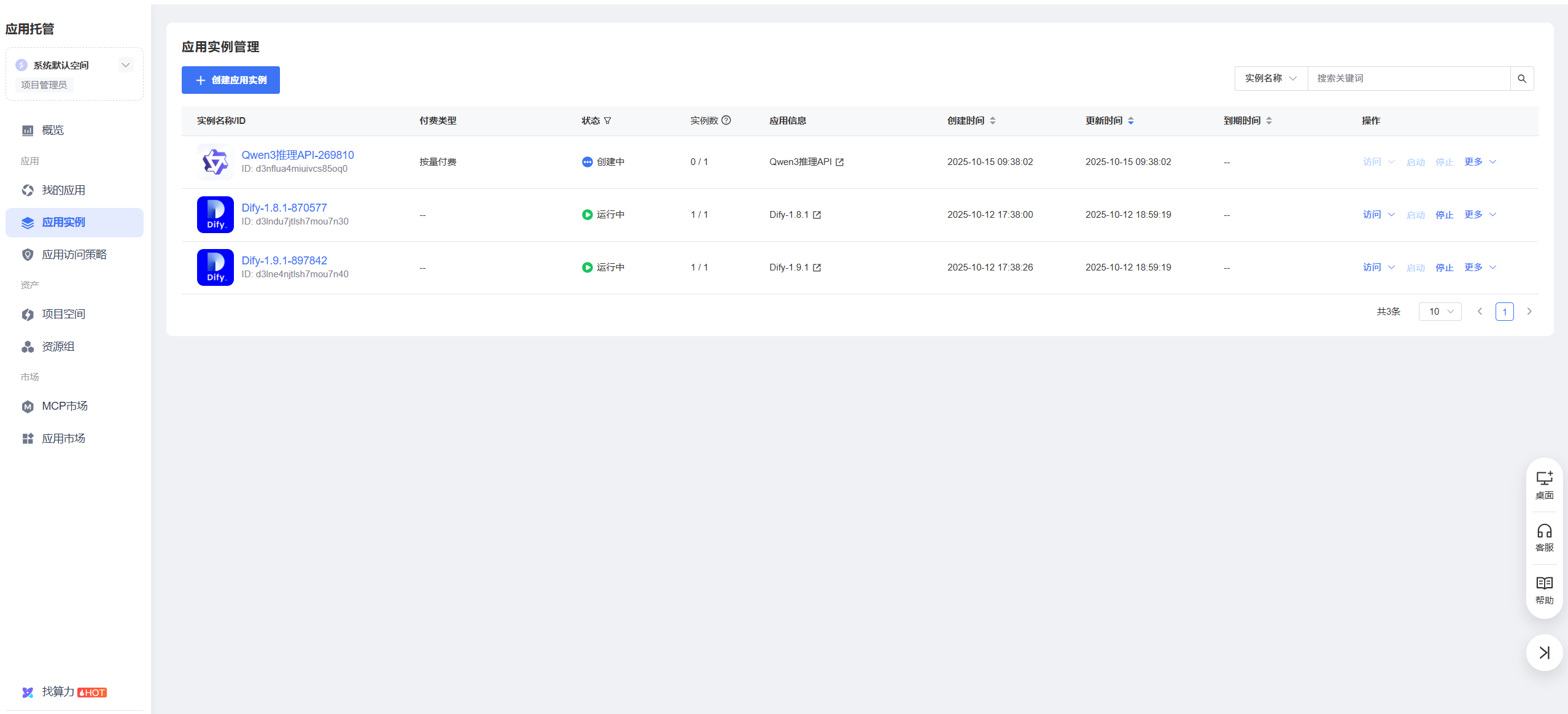 刷新应用实例列表,等待新创建的应用进入到【运行中】状态后点击实例名称,进入实例详情页面。