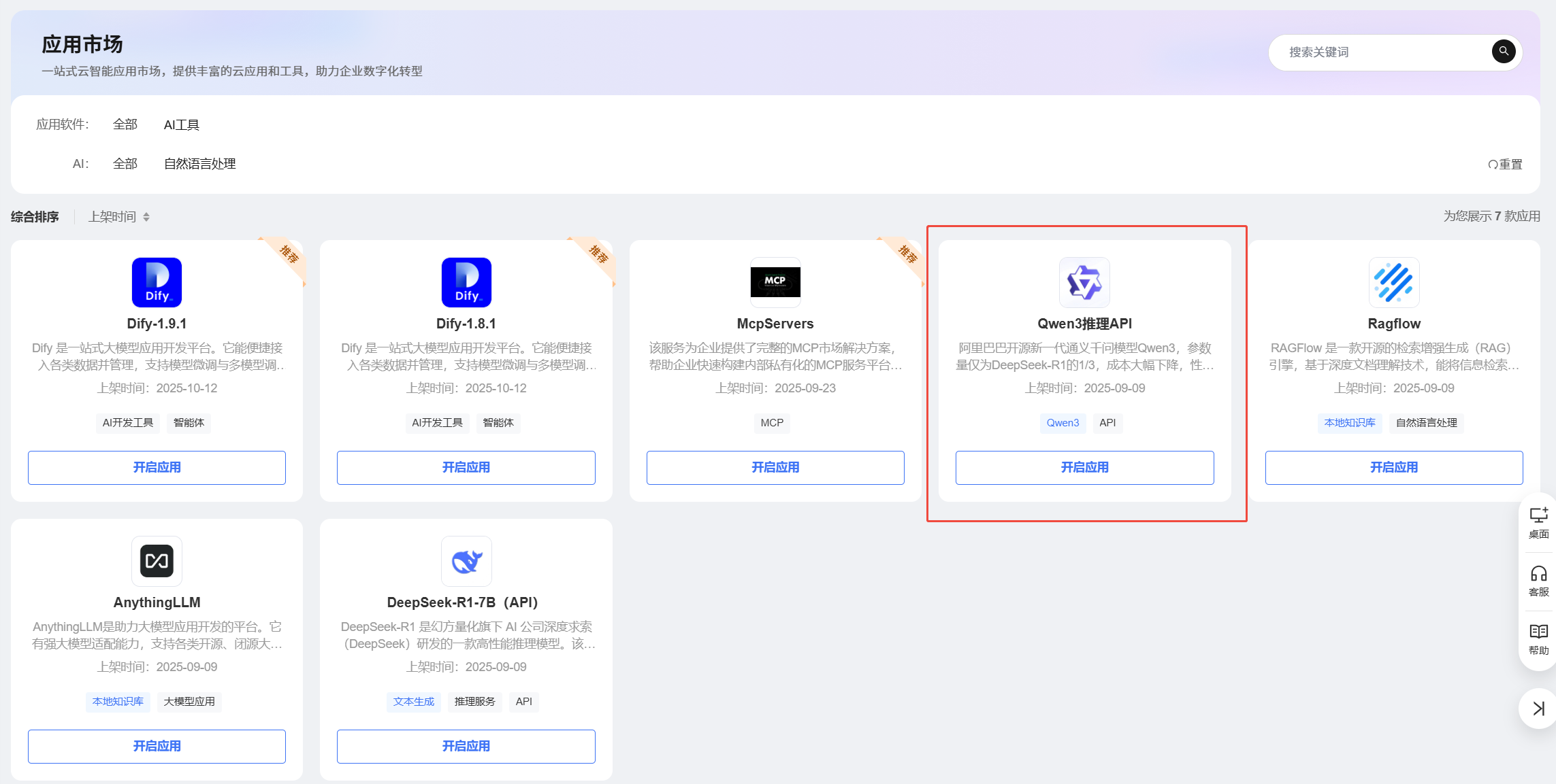 在应用市场页面,选择目标应用,点击【开启应用】,进入应用部署页面。