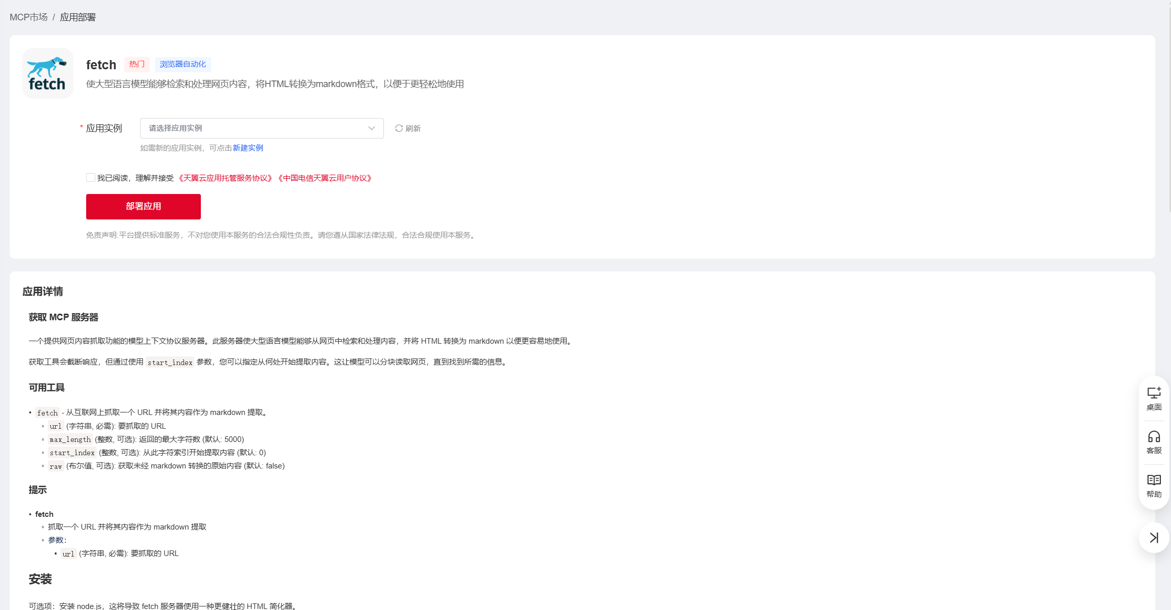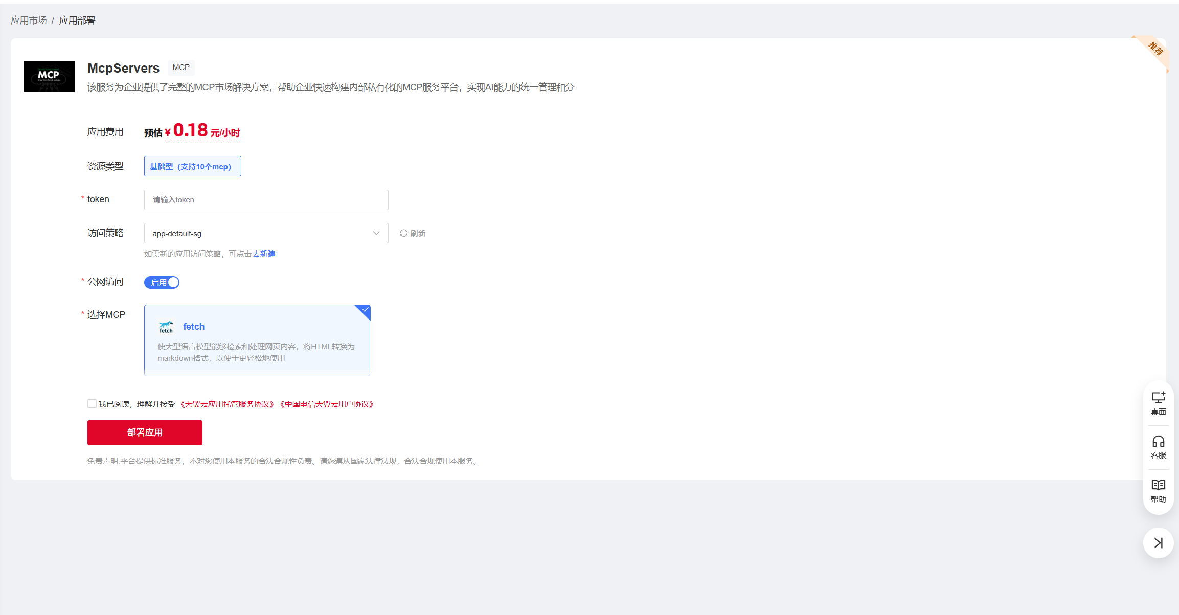 选择已经部署的MCP Servers应用实例,填写必要的参数,勾选协议,点击【立即部署】按钮。