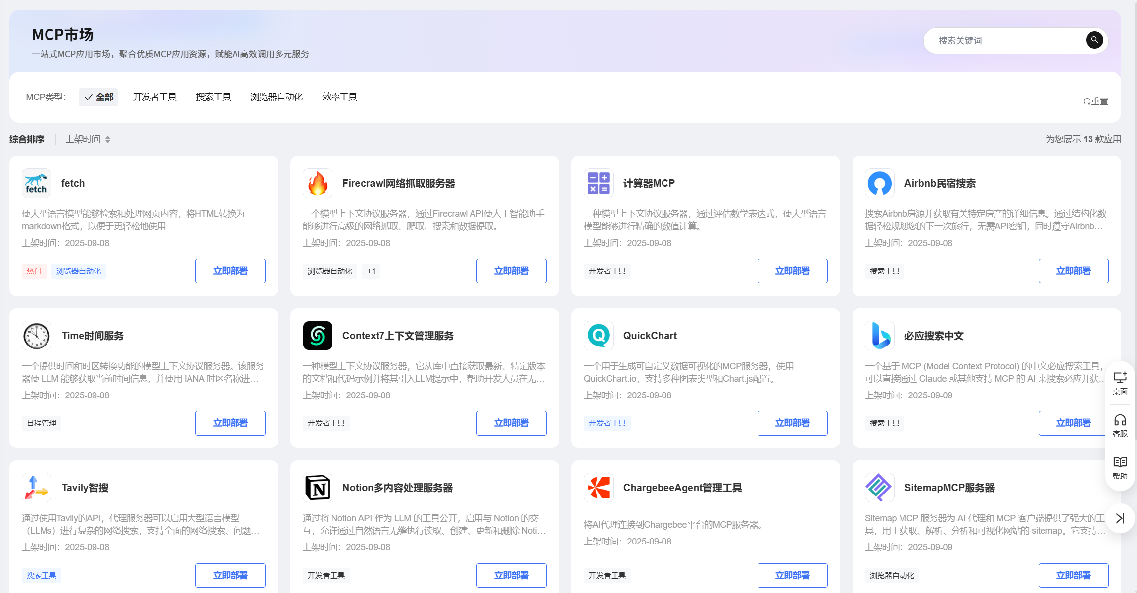 MCP是指Model Calling Platform相关的服务资源,涵盖内容生成、网页搜索、效率工具等多种类型,全面支撑企业各类智能应用场景。