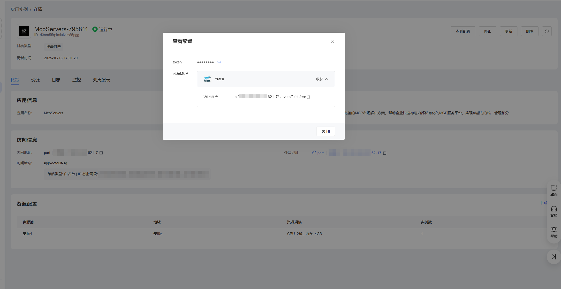 应用实例创建完成后,点击查看配置,可以看到对应MCP的访问地址。