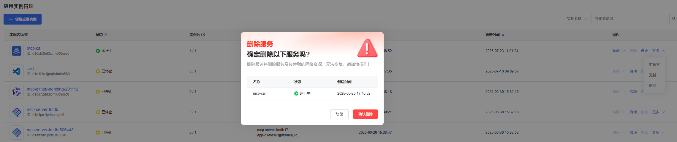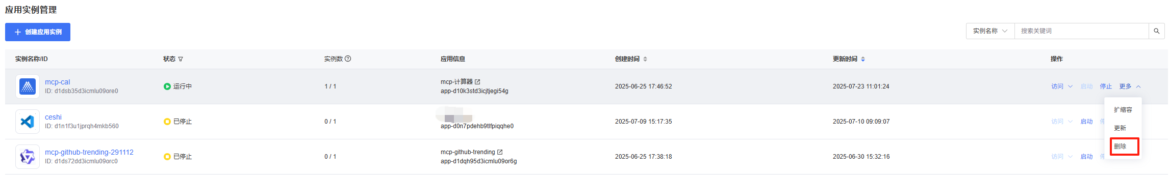 登录应用托管控制台,在左侧导航栏单击【应用实例】,在列表页,找到需要删除的实例,在操作栏点击【删除】按钮。