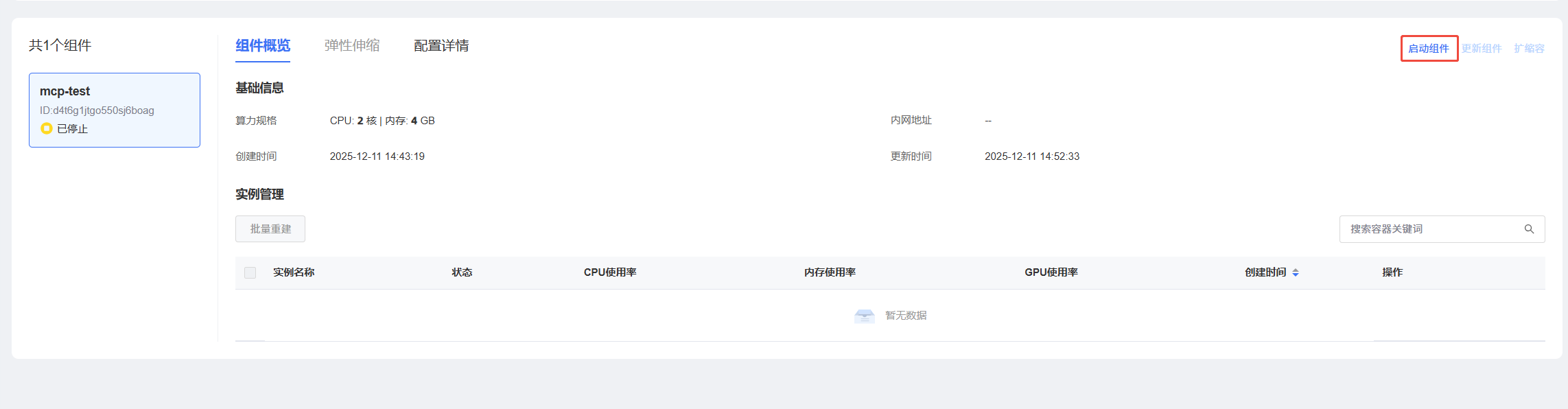 当进入应用实例详情,选择停止状态组件,在操作栏点击【启动组件】操作。