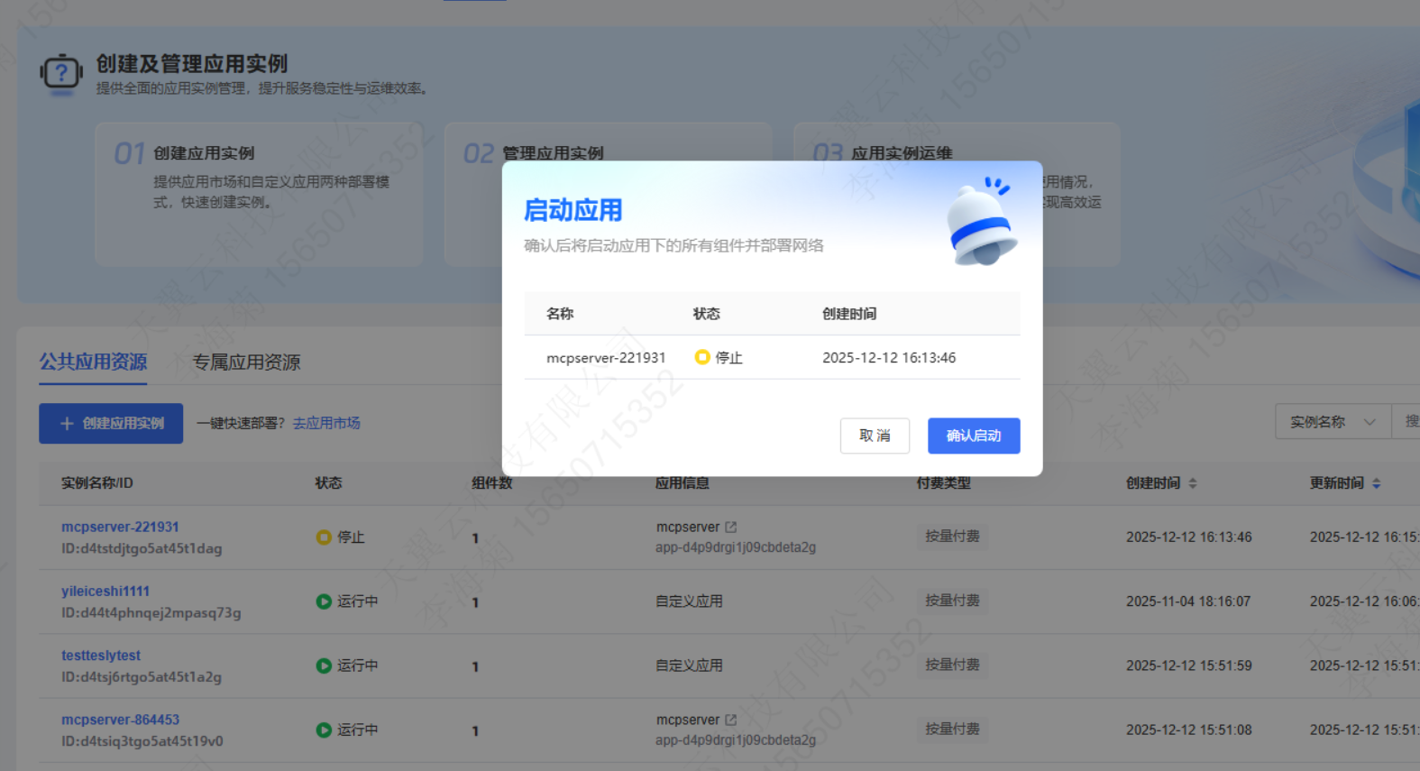 登录应用托管控制台,在左侧导航栏单击【应用实例】,在列表页,找到需要启动的实例,在操作栏点击【启动】按钮。