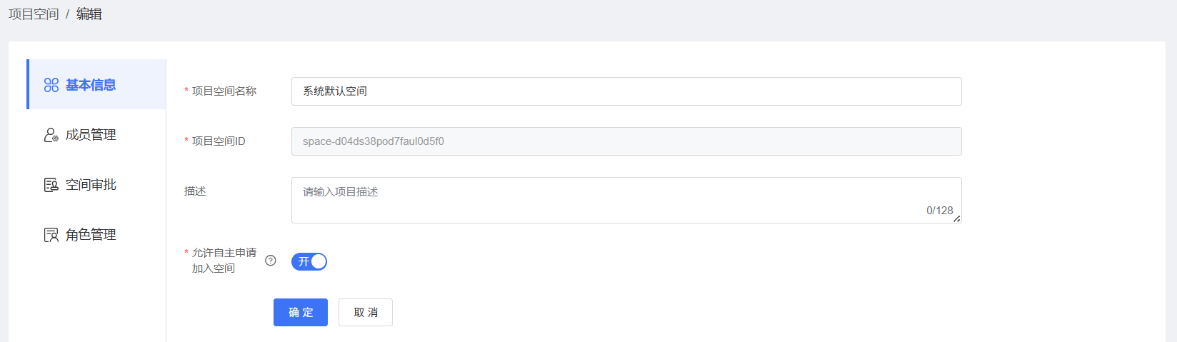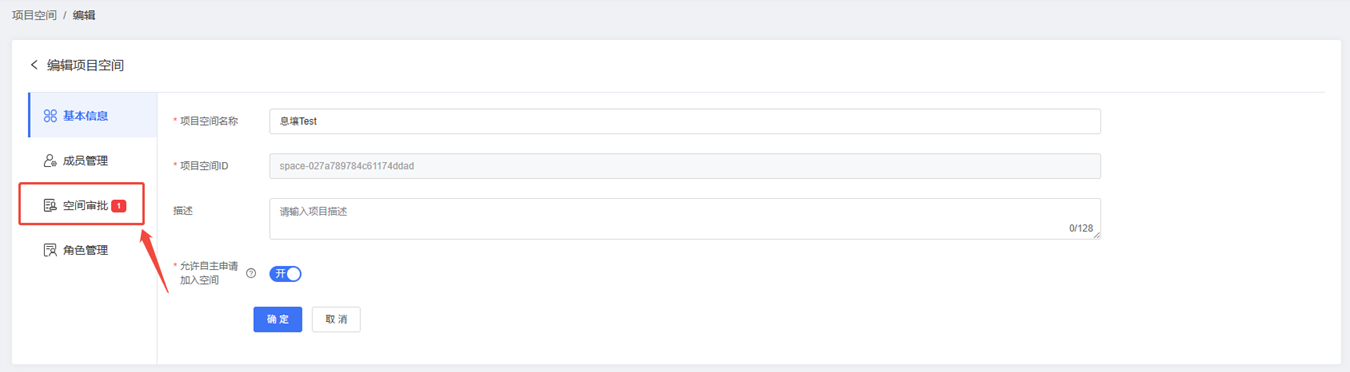 在【基本信息】栏目,可以修改项目空间名称、项目描述等信息,单击【确定】按钮保存修改。若您希望其他用户可以自主申请加入您的项目空间,可以打开【允许自主申请加入项目空间】开关。空间加入申请可在【空间审批】中查看。