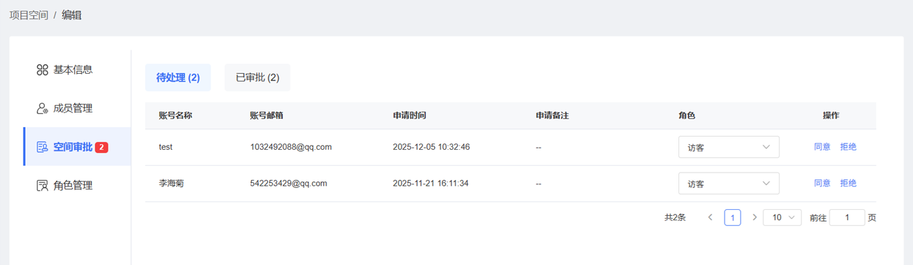 在项目空间审批列表,找到需要处理的申请消息,为用户选择项目空间角色,并单击【同意】即可允许该用户加入该项目空间,单击【拒绝】则会驳回该用户的申请。