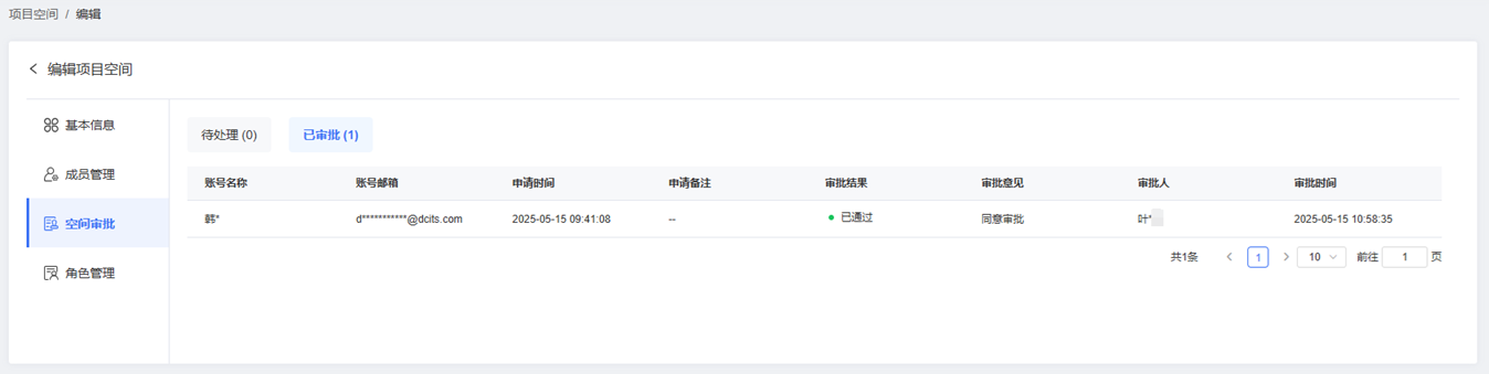 在项目空间编辑页面,单击【空间审批】进入项目审批管理页面,您可在【空间审批】查看其他用户的空间加入申请并进行处理。