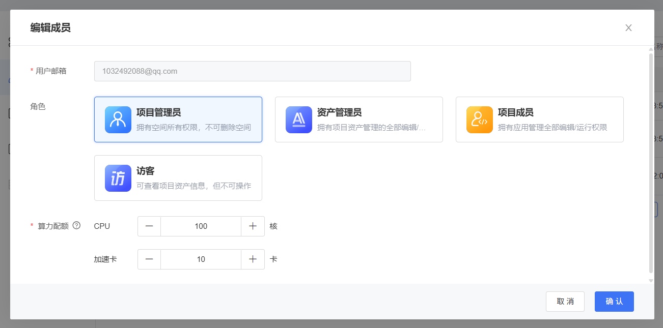 添加成员:单击【添加成员】按钮,在添加成员弹窗页面输入用户邮箱,配置角色和算力配额,单击【确认】即可邀请指定用户加入空间。